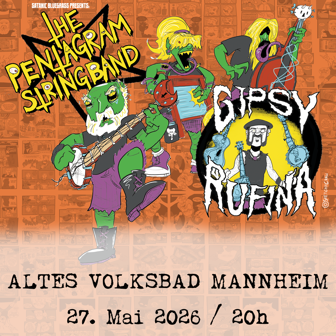Die Pentagram String Band sind eine satanische Bluegrass-Band aus Kansas City, Missouri. Sie stehen dem traditionellen Bluegrass skeptisch gegenüber und spielen eine Mischung aus Gothic Folk, Punk und Thrash Metal. Ihre Texte drehen sich oft um Kannibalismus und Mord und behandeln Themen wie Satan, Elend und die Freuden des Todes. … und es sind großartige, nette Menschen mit einem guten Sinn für Humor!