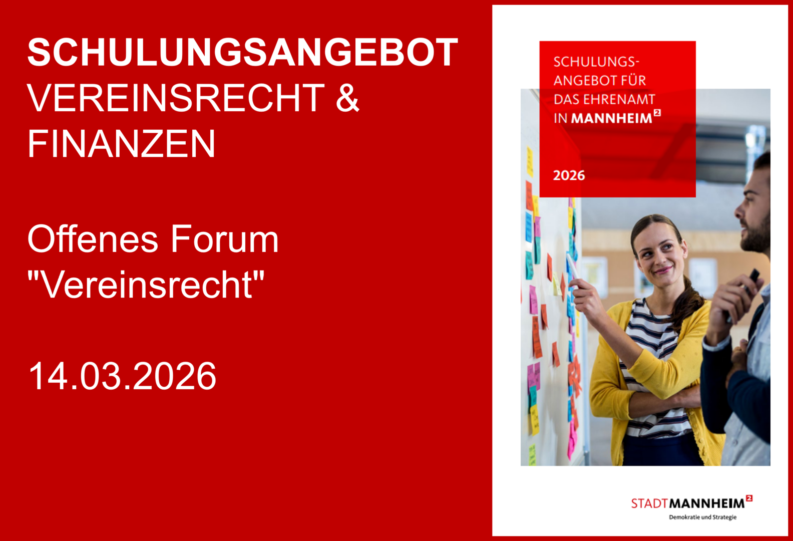 Sie möchten sich fit machen für ein Ehrenamt oder Ihr bereits bestehendes Wissen ausbauen? Der Fachbereich Demokratie und Strategie bietet eine Seminarreihe an, bei dem ein Team aus Expert*innen Ihnen beratend zur Seite steht und Sie für die Vereinstätigkeit sowie das bürgerschaftliche Engagement qualifiziert. Das vollständige Seminarangebot und die Anmeldemöglichkeiten sind unter www.mannheim.de/schulungsangebot zu finden.