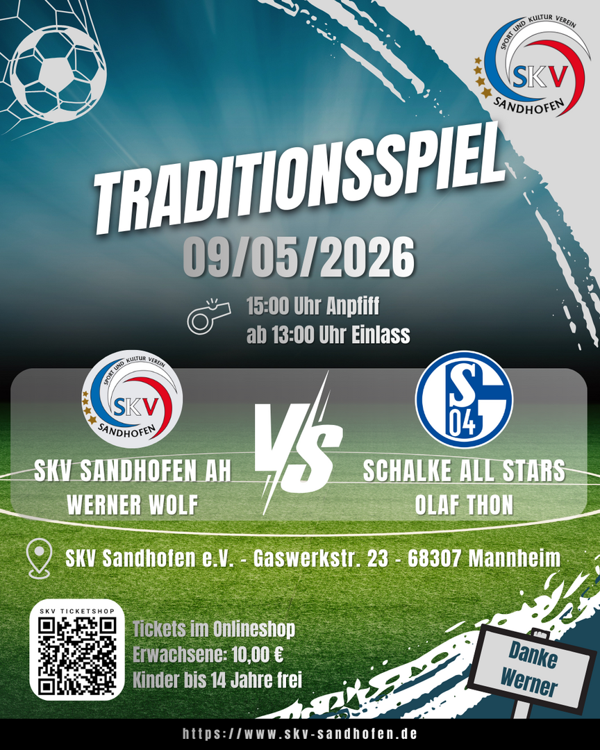 Am 09.05.2026 erwarten wir voller Freude die Schalker Traditionself mit Weltmeister Olaf Thon in Sandhofen. Um 15:00 Uhr beginnt das große Duell unserer SKV Sandhofen AH gegen die Schalke All Stars – ein Aufeinandertreffen, das Spannung garantiert.