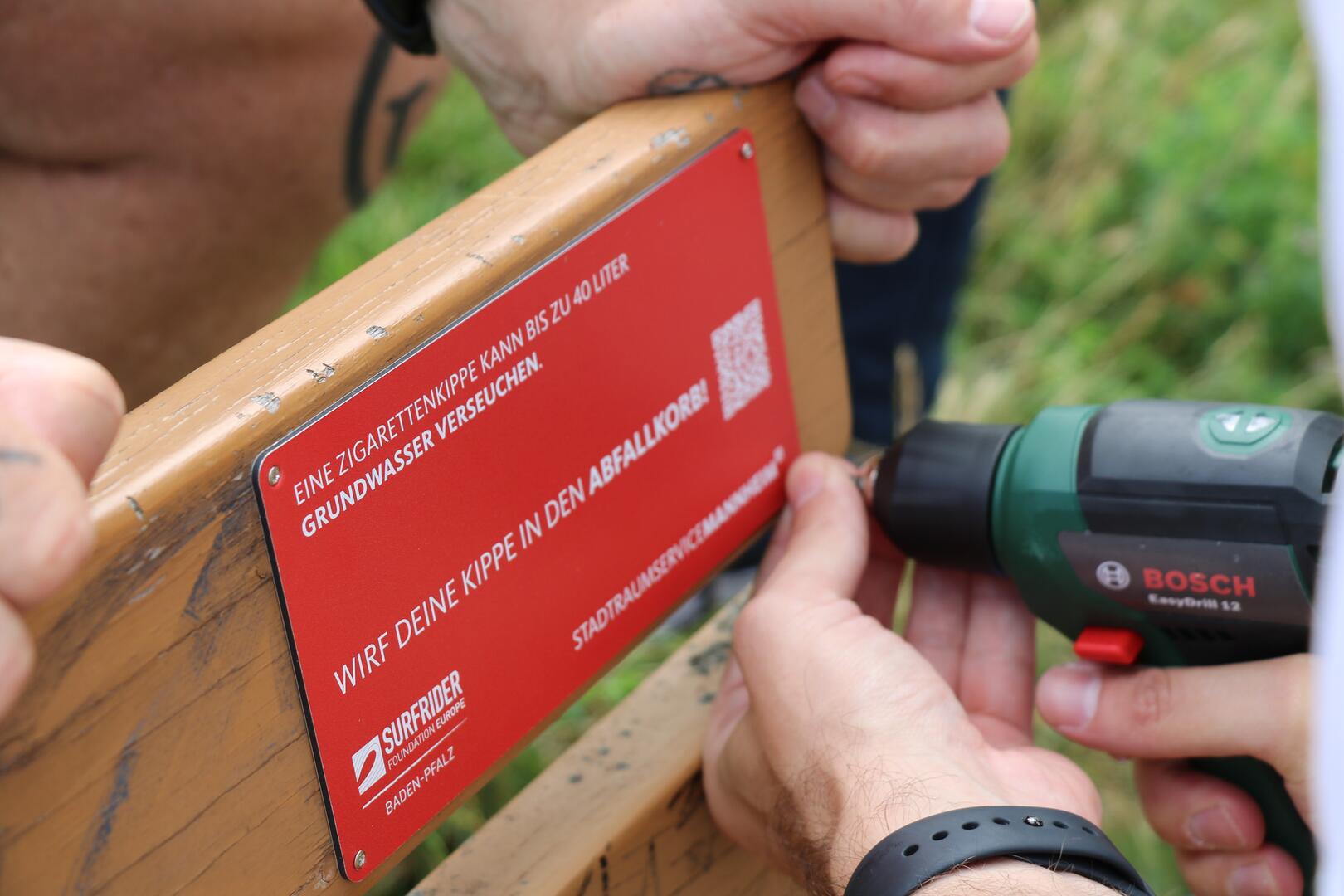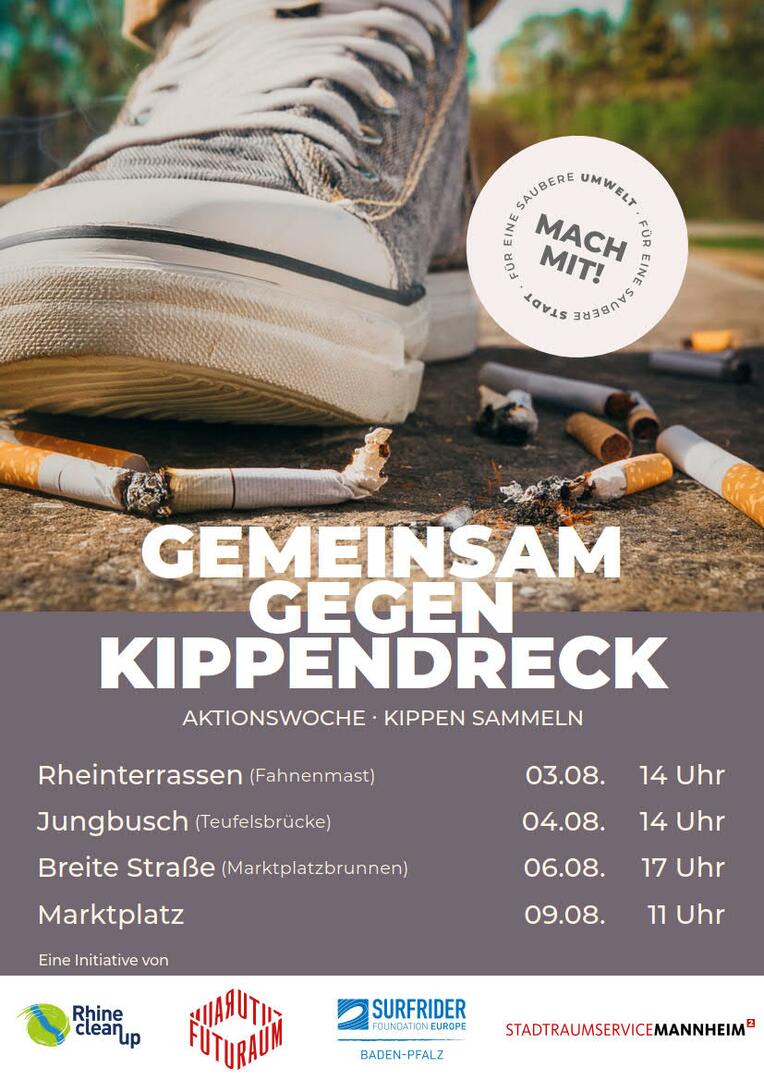 Im Rahmen der Aktionswoche "Gemeinsam gegen Kippendreck" hat der Stadtraumservice eine Aktion der Surfrider Baden-Pfalz unterstützt, indem die vorhandenen Abfallkörbe mit neuen Abfallkörben mit Aschenbecher ausgetauscht wurden. Gemeinsam wurden Hinweisschilder gestaltet, die an den Parkbänken an den Rheinterrassen angebracht wurden. Die Hinweisschilder informieren über die gefährlichen Umweltauswirkungen von auf dem Boden liegenden Zigarettenkippen.