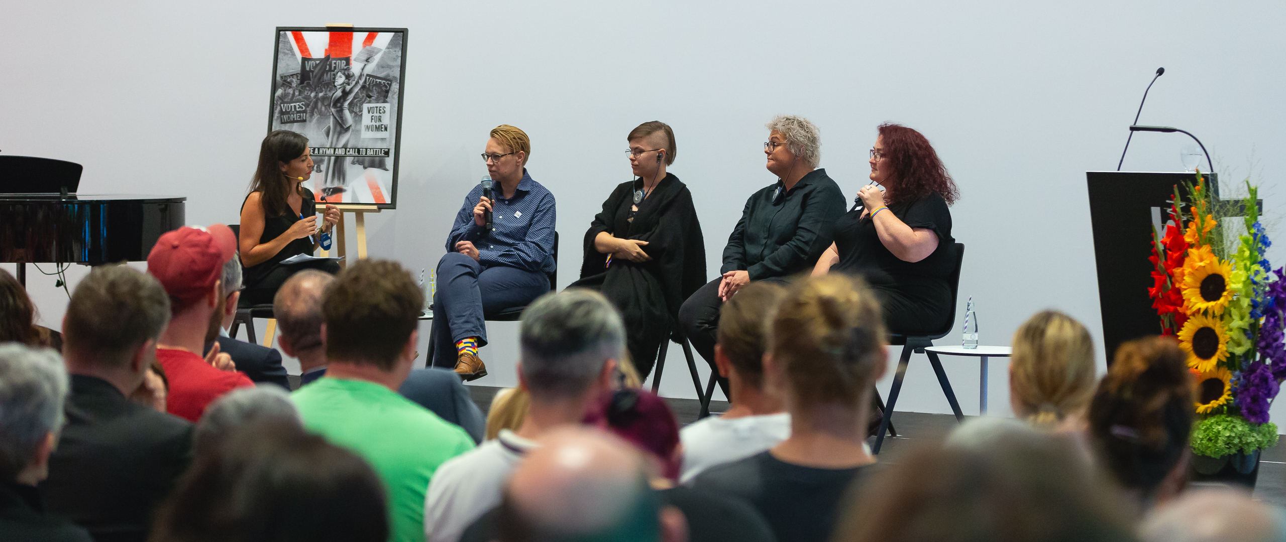 Moderatorin Rosa Omeñaca Prado und die Aktivistinnen Stephanie Kuhnen aus Berlin Charlottenburg-Wilmersdorf, Sida Olesiak aus dem polnischen Bydgoszcz, Oksy Morar aus dem litauischen Klaipėda sowie Alys Einion aus dem walisischen Swansea (v. l.) bei einer Talkrunde