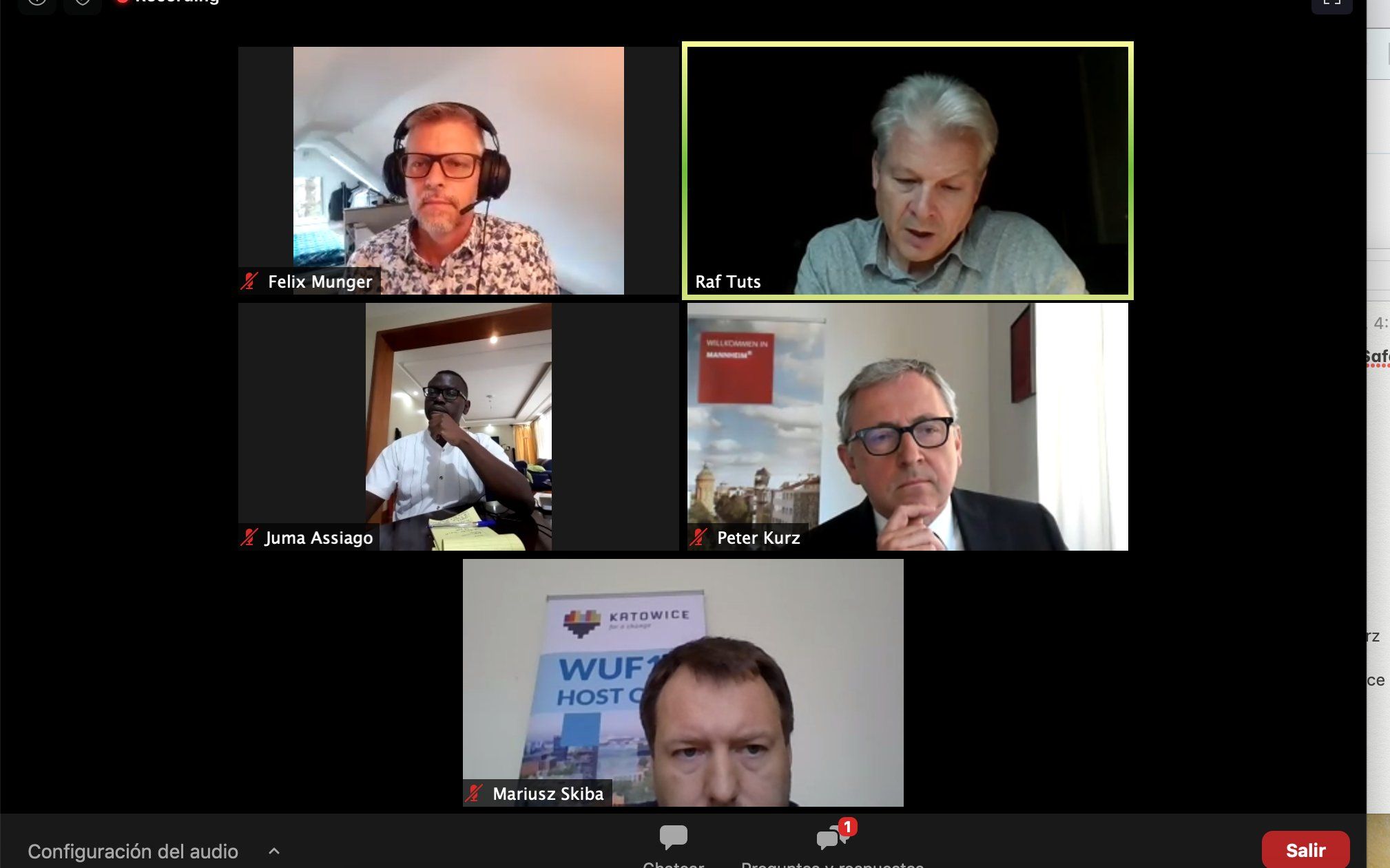 Oberbürgermeister Dr. Peter Kurz bei der Podiumsdiskussion mit Staatssekretär im Ministerium für Umwelt, Klima und Energiewirtschaft Baden-Württemberg, Dr. Andre Baumann, dem stellvertretenden Bürgermeister für Mobilität, städtische Logistik und öffentlichen Raum der Stadt Lyon, Valentin Lungenstrass, und der stellvertretenden Leiterin der EU-Städte-Mission in der Europäischen Kommission, Rosalinde van der Vlies.