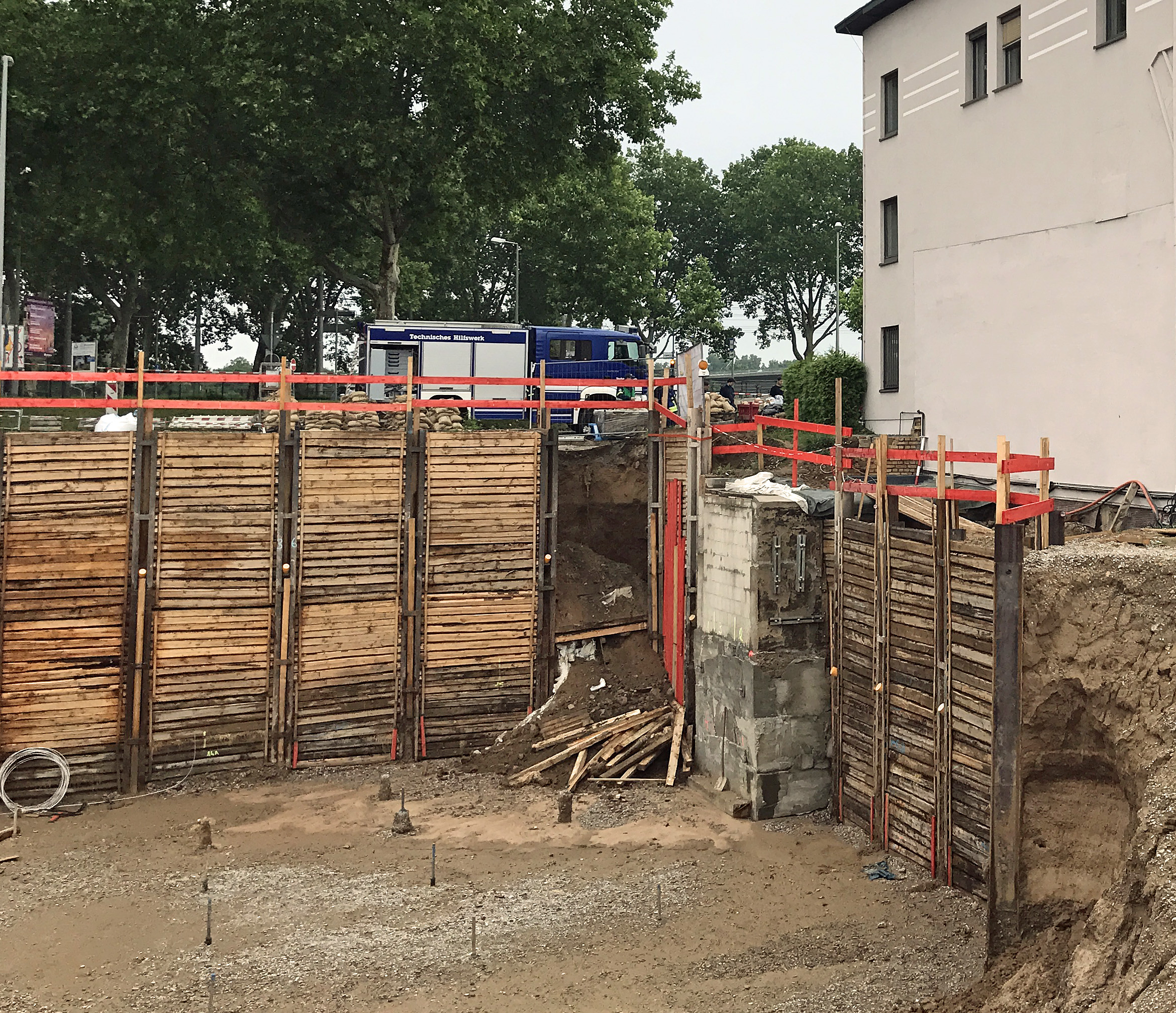 • Durch die schweren Regenschauer wurden die Spundwände stellenweise von den Erdmassen durchbrochen.