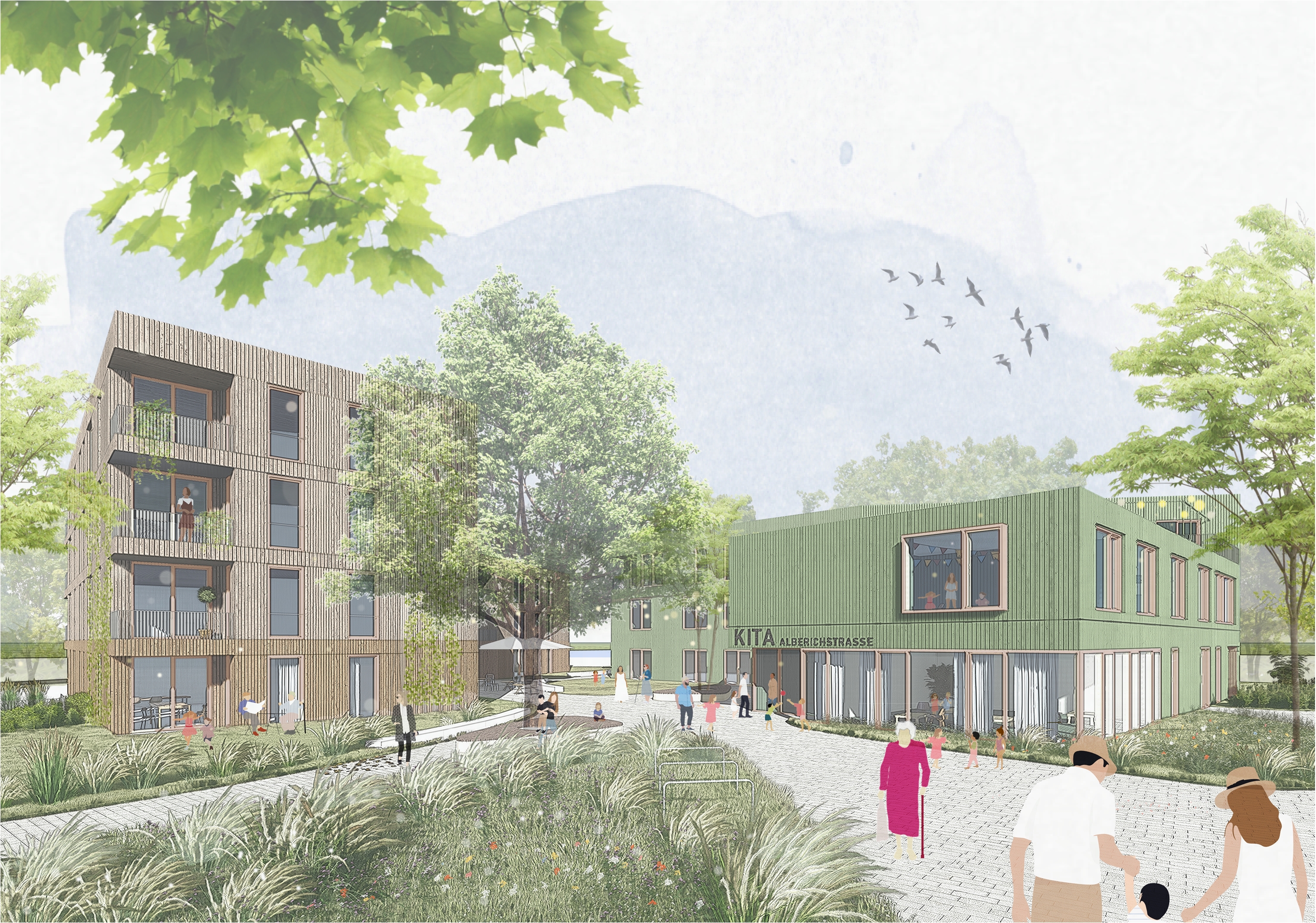 Visualisierung Theodor Fliedner Stiftung, Betreutes Wohnen und Kita Ma-Niederfeld, Stand Wettbewerb