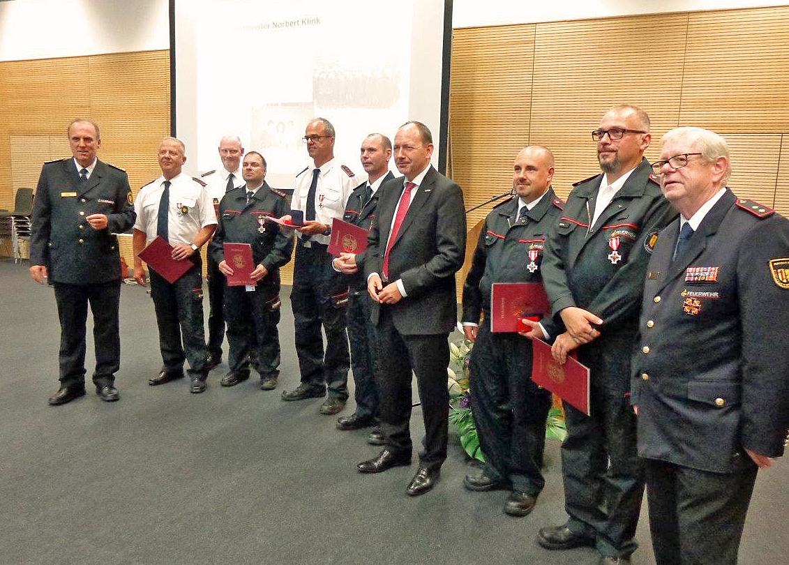 Erster Bürgermeister Christian Specht (4. von links) ehrte die Feuerwehrleute.