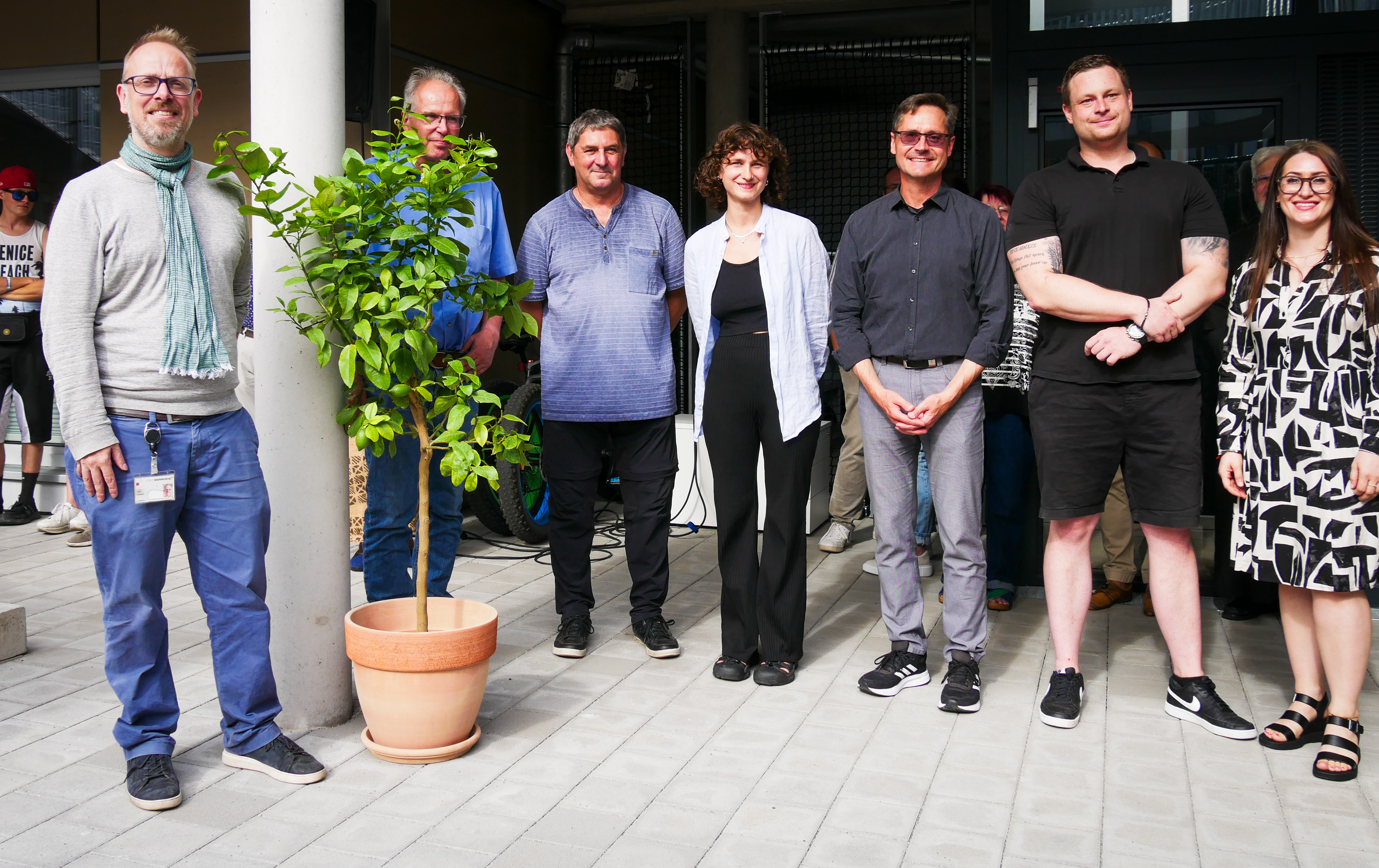 Erste Bürgermeisterin Prof. Dr. Diana Pretzell (Bildmitte) eröffnet mit Mitarbeitern des Stadtraumservice und beteiligten Skatern den Skatepark im Lindenhof