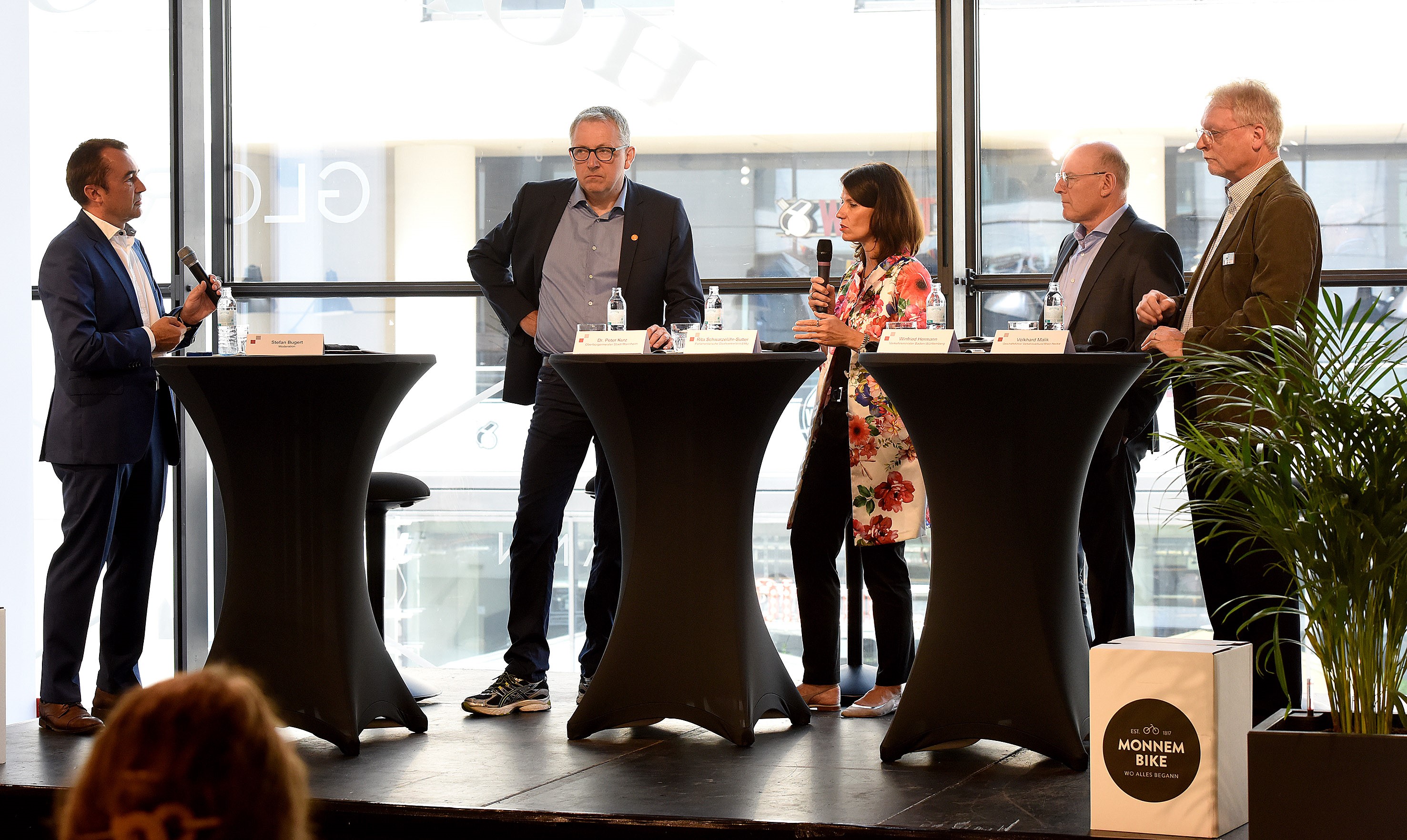 v.l.: Stefan Bugert, Moderation, Oberbürgermeister Dr. Peter Kurz, Rita Schwarzelühr-Sutter, Parlamentarische Staatssekretärin des Bundesministeriums für Umwelt, Naturschutz und nukleare Sicherheit, Verkehrsminister Baden-Württemberg Winfried Hermann, Volkhard Malik, Geschäftführer Verkehrsverbund Rhein-Neckar