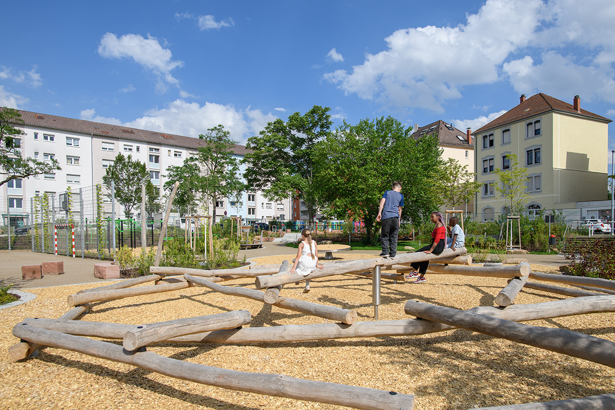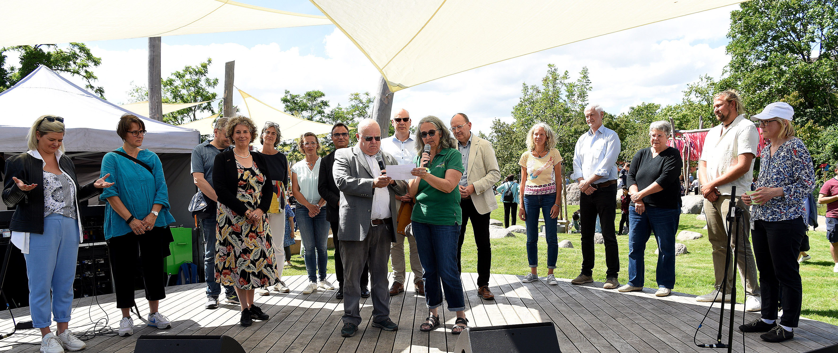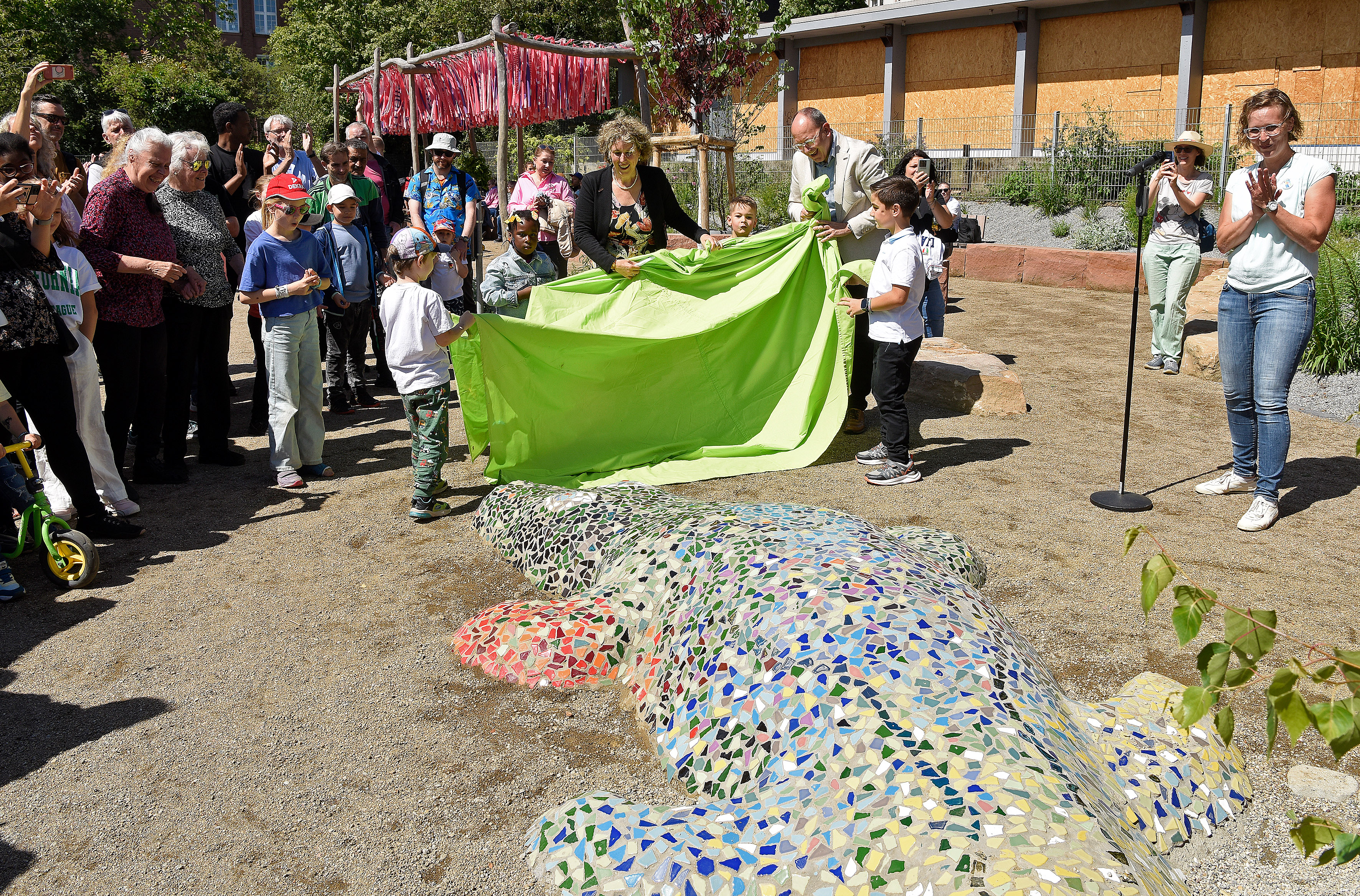 Oberbürgermeister Christian Specht und Erste Bürgermeisterin Prof. Dr. Diana Pretzell enthüllen das von Kindern und Jugendlichen selbst gebaute Krokodil auf dem Mehrgenerationenspielplatz in Rheinau