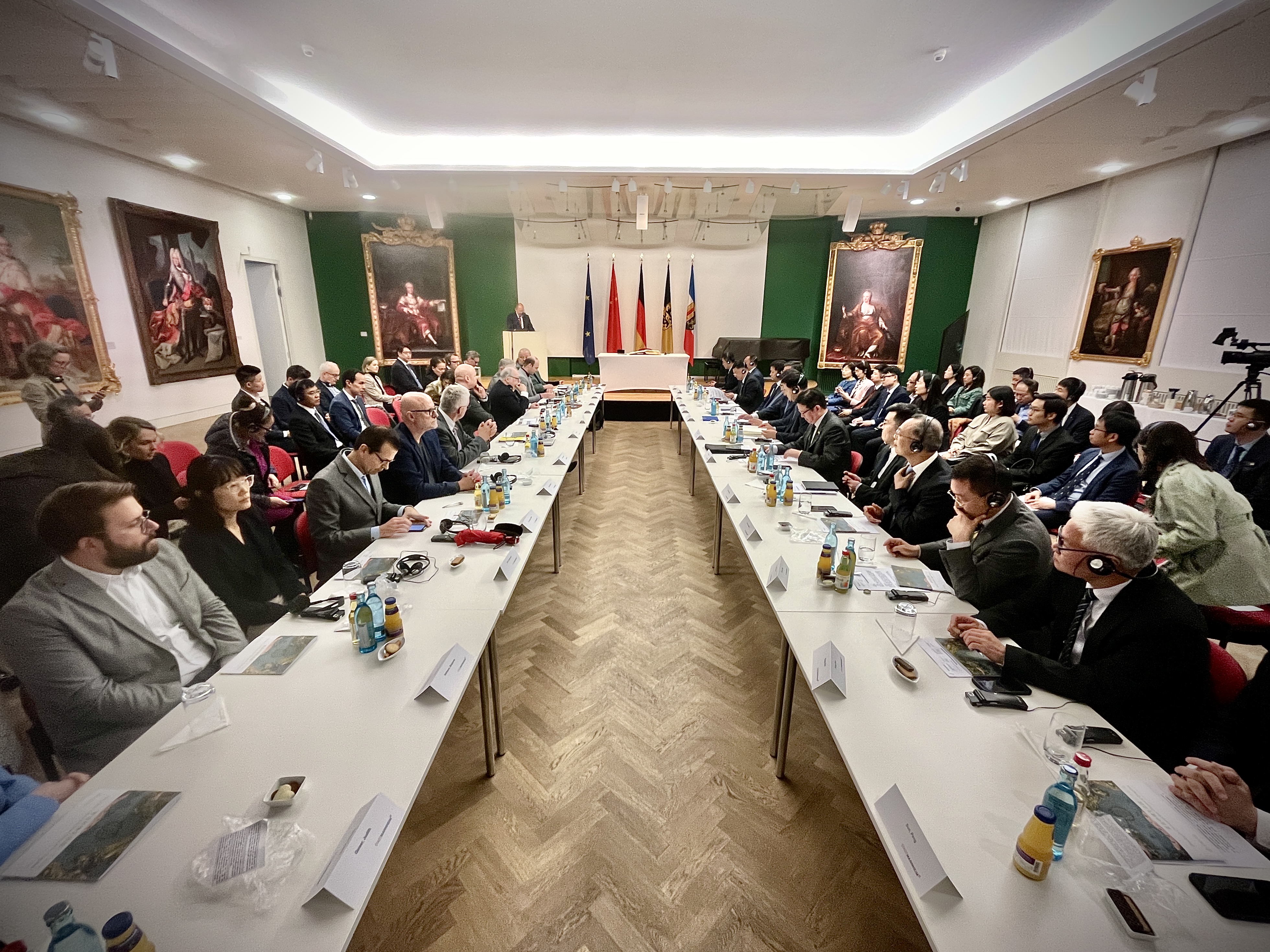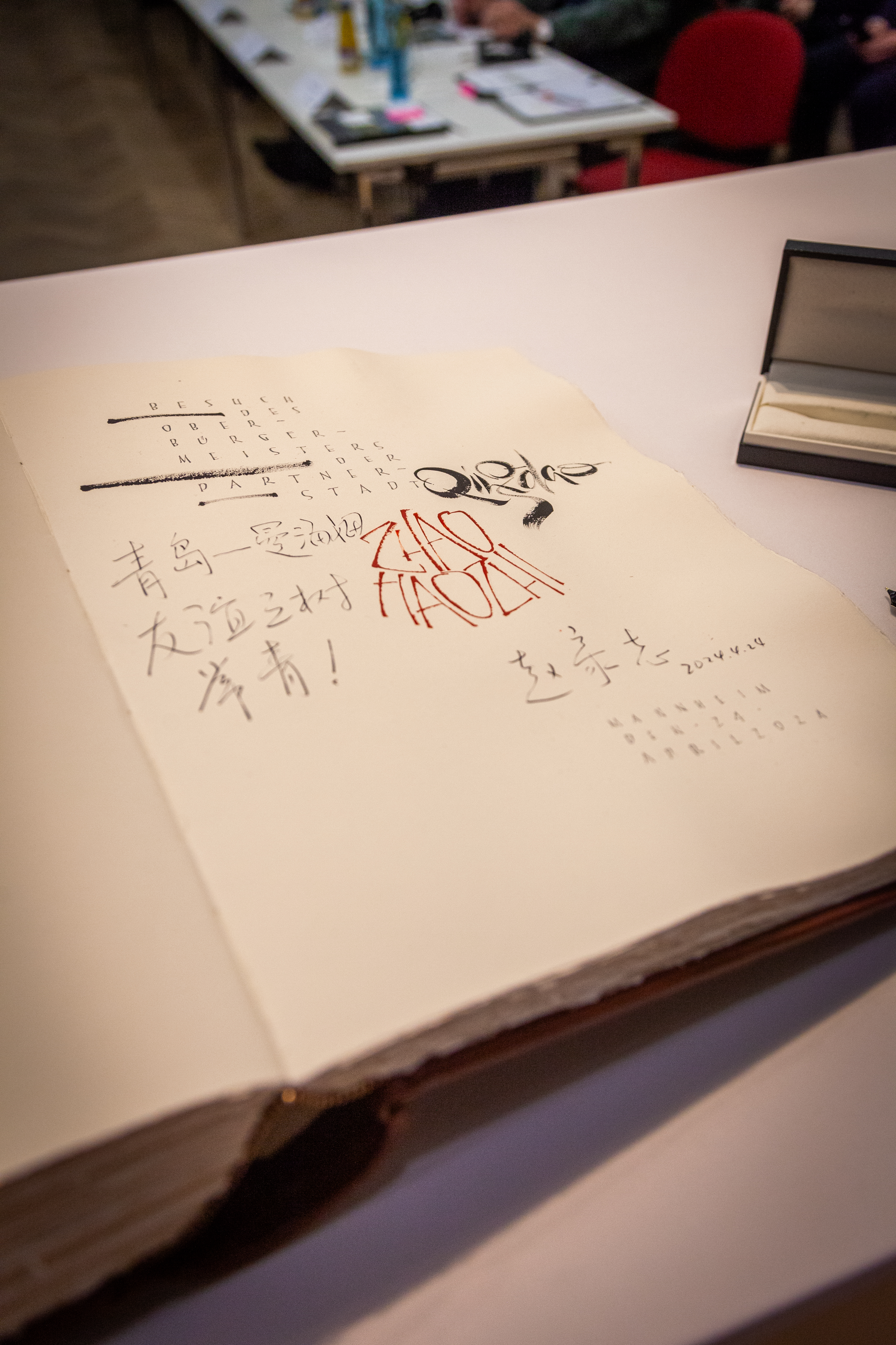 Unser Bild zeigt den Oberbürgermeister der Stadt Qingdao, Haozhi Zhao, der sich ins Goldene Buch der Stadt Mannheim einträgt. Hinter ihm Oberbürgermeister Christian Specht.