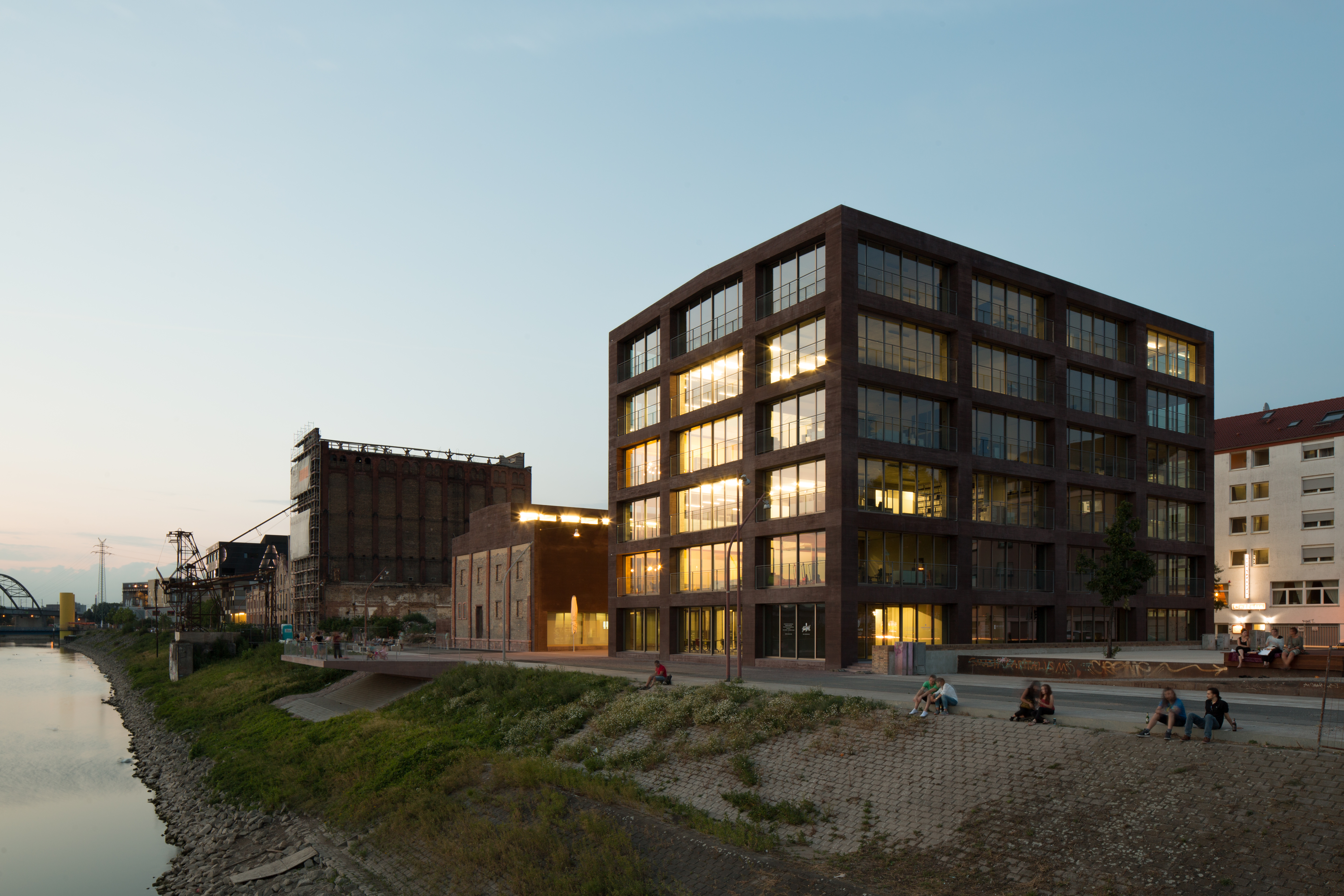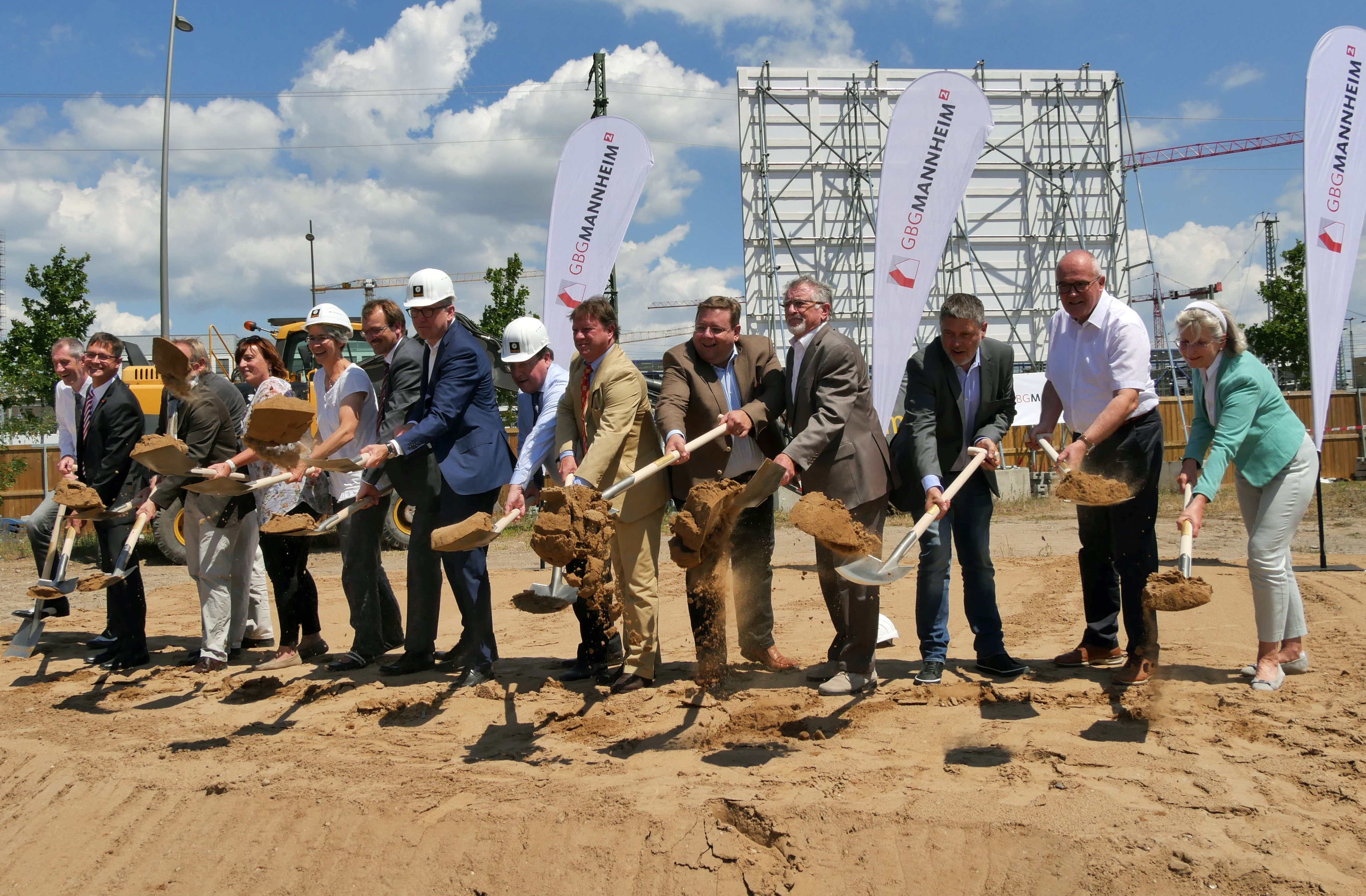Oberbürgermeister Dr. Peter Kurz, Karl-Heinz Frings, Geschäftsführer der GBG - Mannheimer Wohnungsbaugesellschaft, sowie Vertreter aus dem Gemeinderat und der beteiligten Bauunternehmen geben mit dem ersten Spatenstich den Startschuss für den Bau des Neuen Technischen Rathauses im Glücksteinquartier.