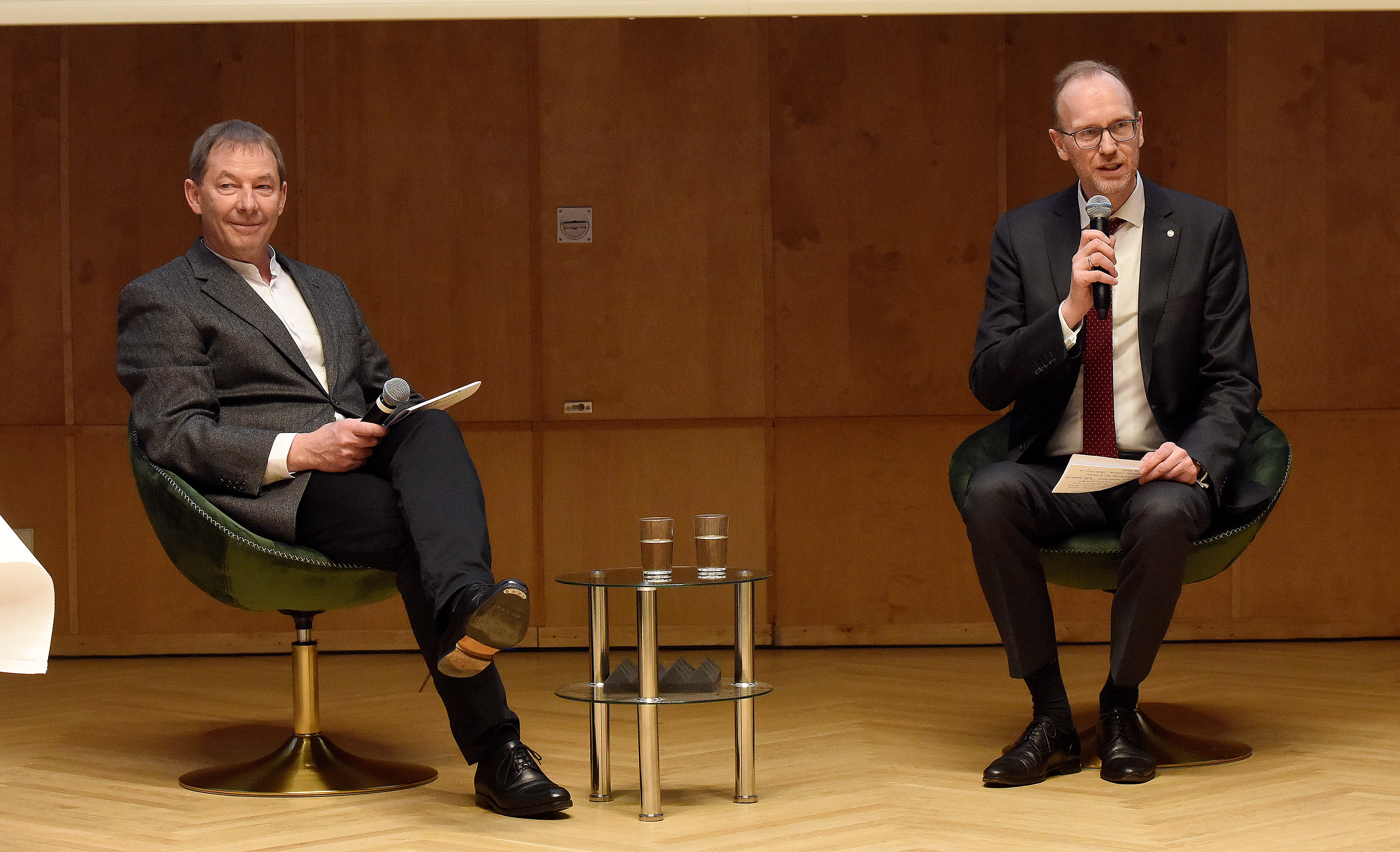 Unser Bild zeigt ein Gespräch zwischen dem Preisträger (links) und Prof. Dr. Henning Lobin, Direktor des Leibnitz-Instituts für Deutsche Sprache in Mannheim