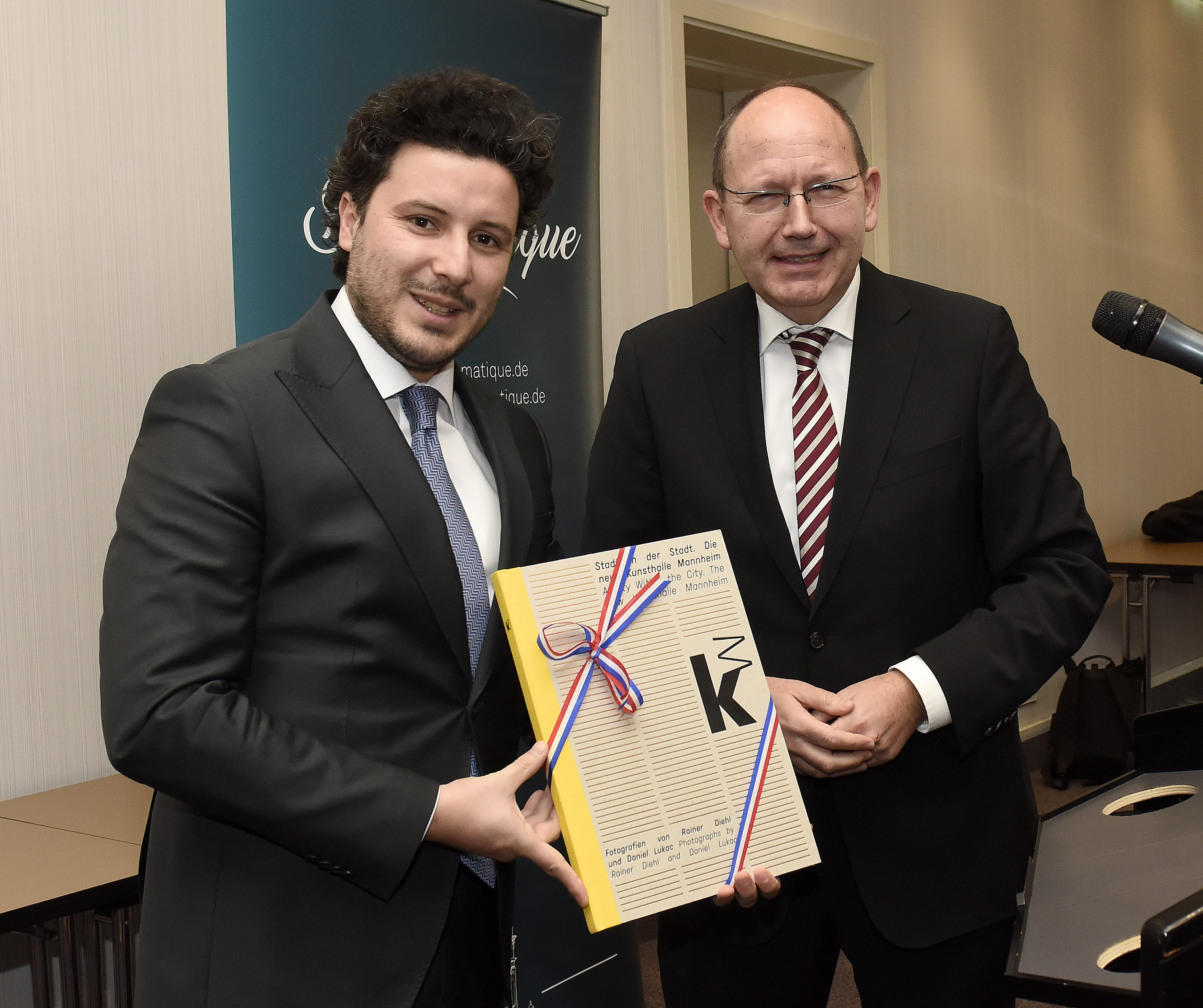 Dr. Dritan Abazović, stellvertretender Ministerpräsident von Montenegro, mit Christian Specht, Erster Bürgermeister der Stadt Mannheim, beim Eintrag in das Goldene Buch der Stadt Mannheim.