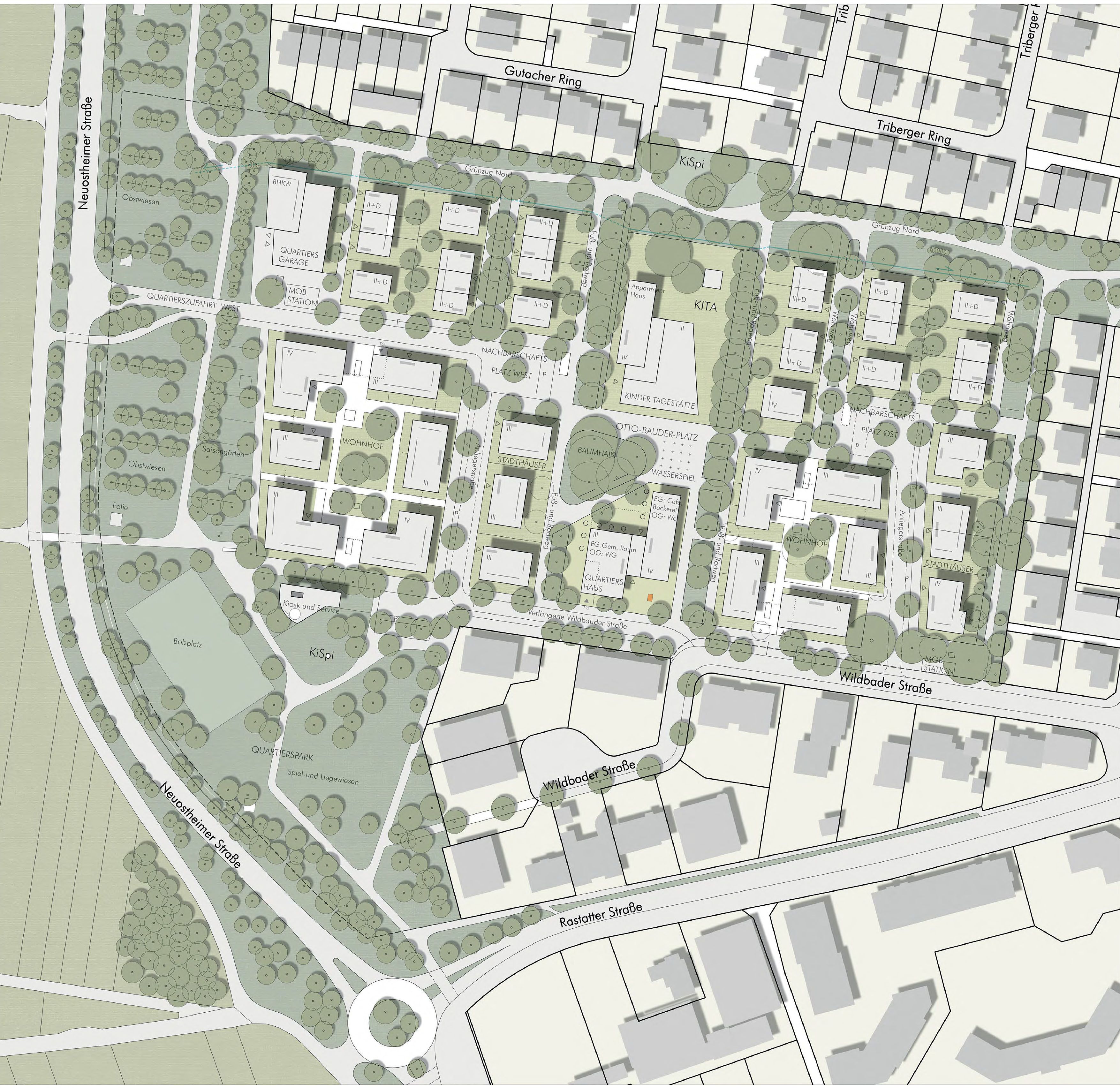 Der Siegerentwurf von Trojan + Trojan zeigt, wie sich das neue Stadtquartier auf der Otto-Bauder-Anlage (gelb unterlegt) stimmig in die bereits bestehende Baustruktur Seckenheims einfügt.