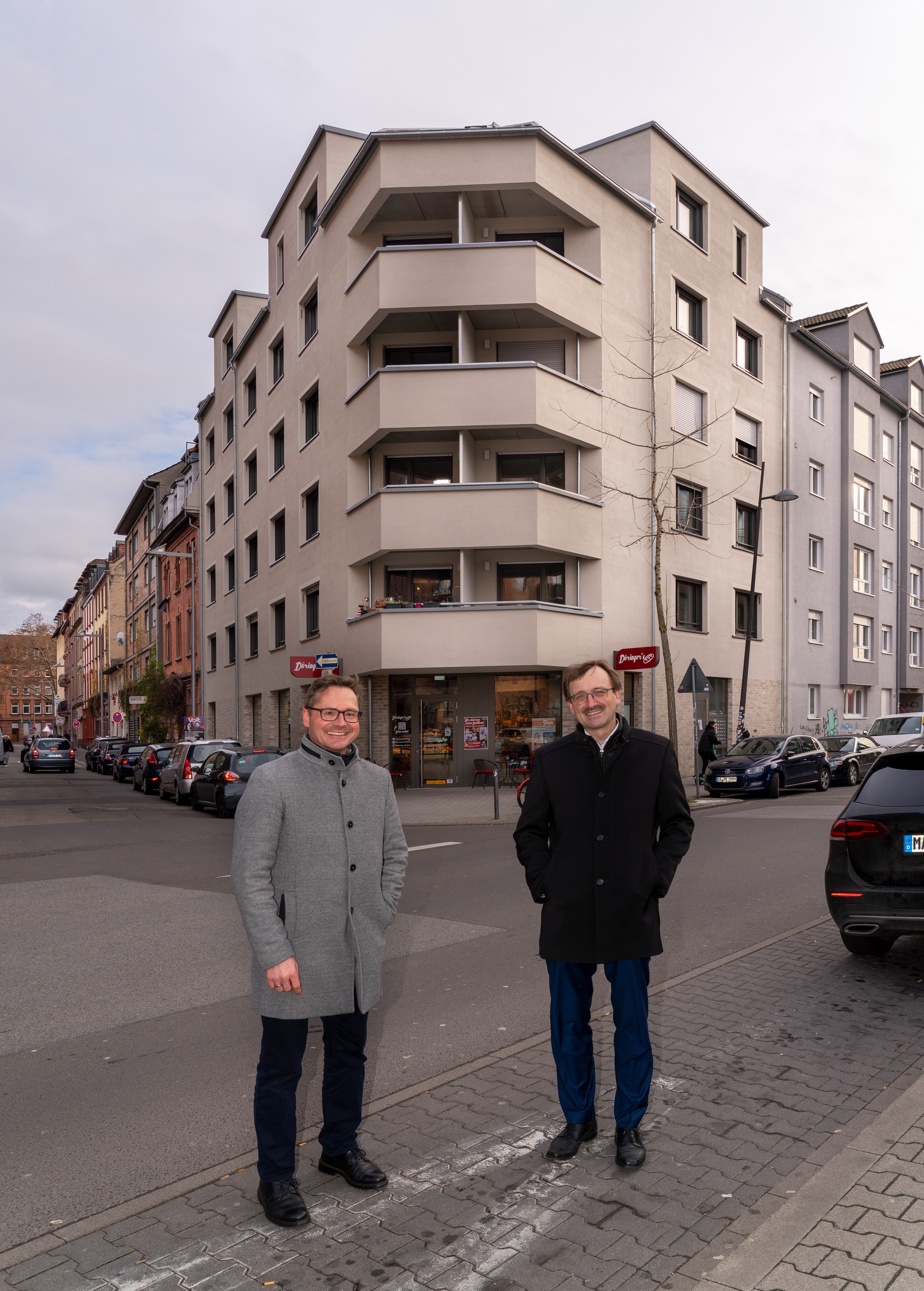 Der Neubau in der Hafenstraße wurde fertiggestellt. Auf dem Bild zu sehen sind Baubürgermeister Ralf Eisenhauer (links) und GBG-Geschäftsführer Karl-Heinz Frings (rechts) bei einer Begehung des Gebäudes.
