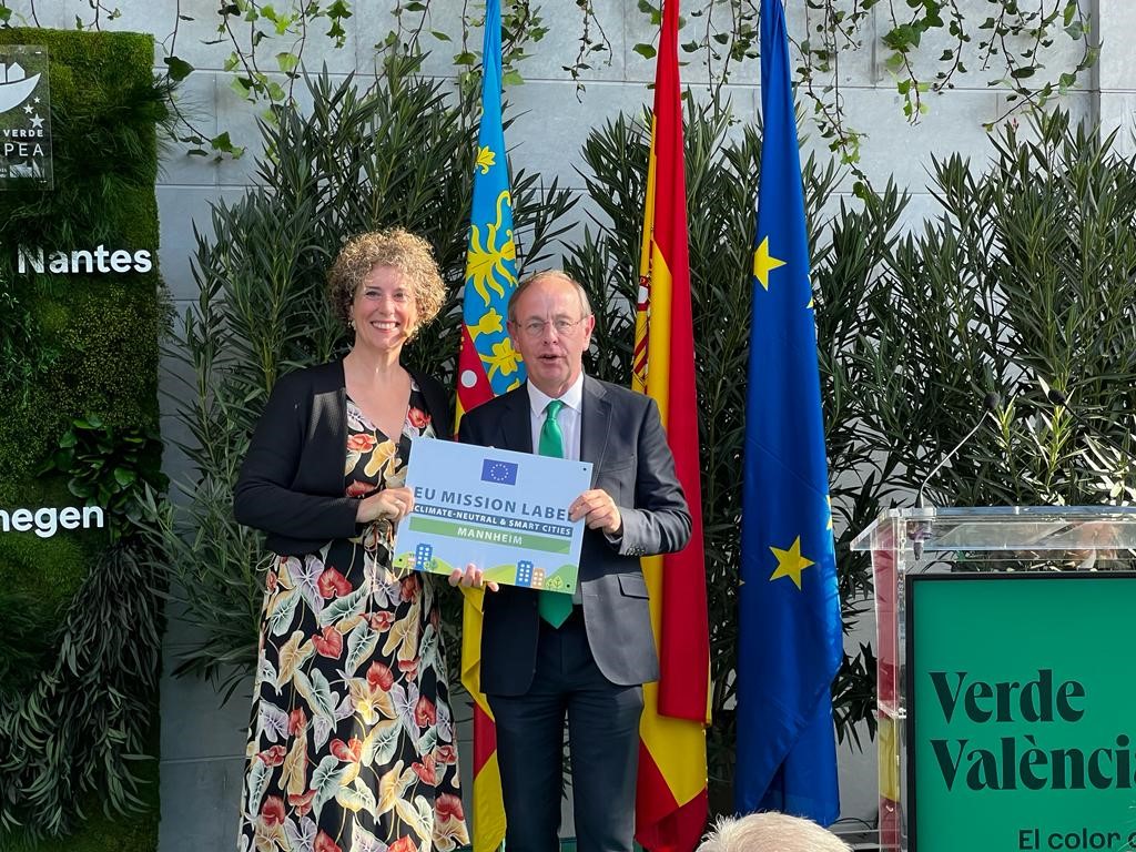 Erste Bürgermeisterin Prof. Dr. Diana Pretzell nimmt in Valencia das EU-Mission Label für klimaneutrale und intelligente Städte vom EU-Mission Manager Patrick Child entgegen.