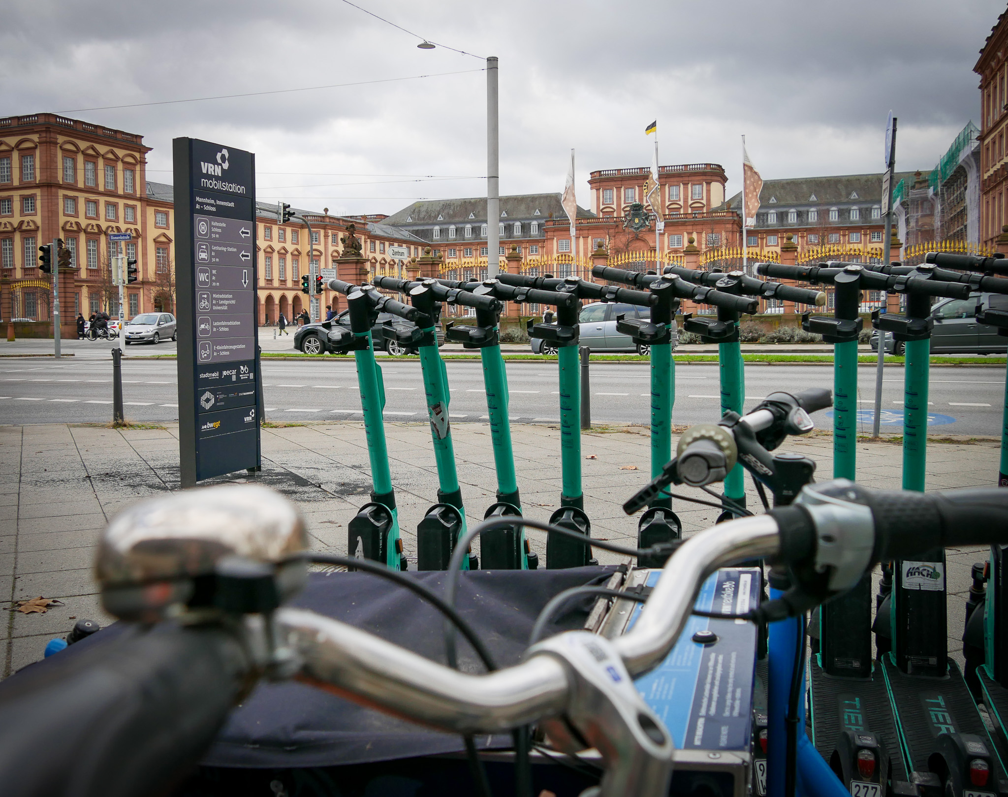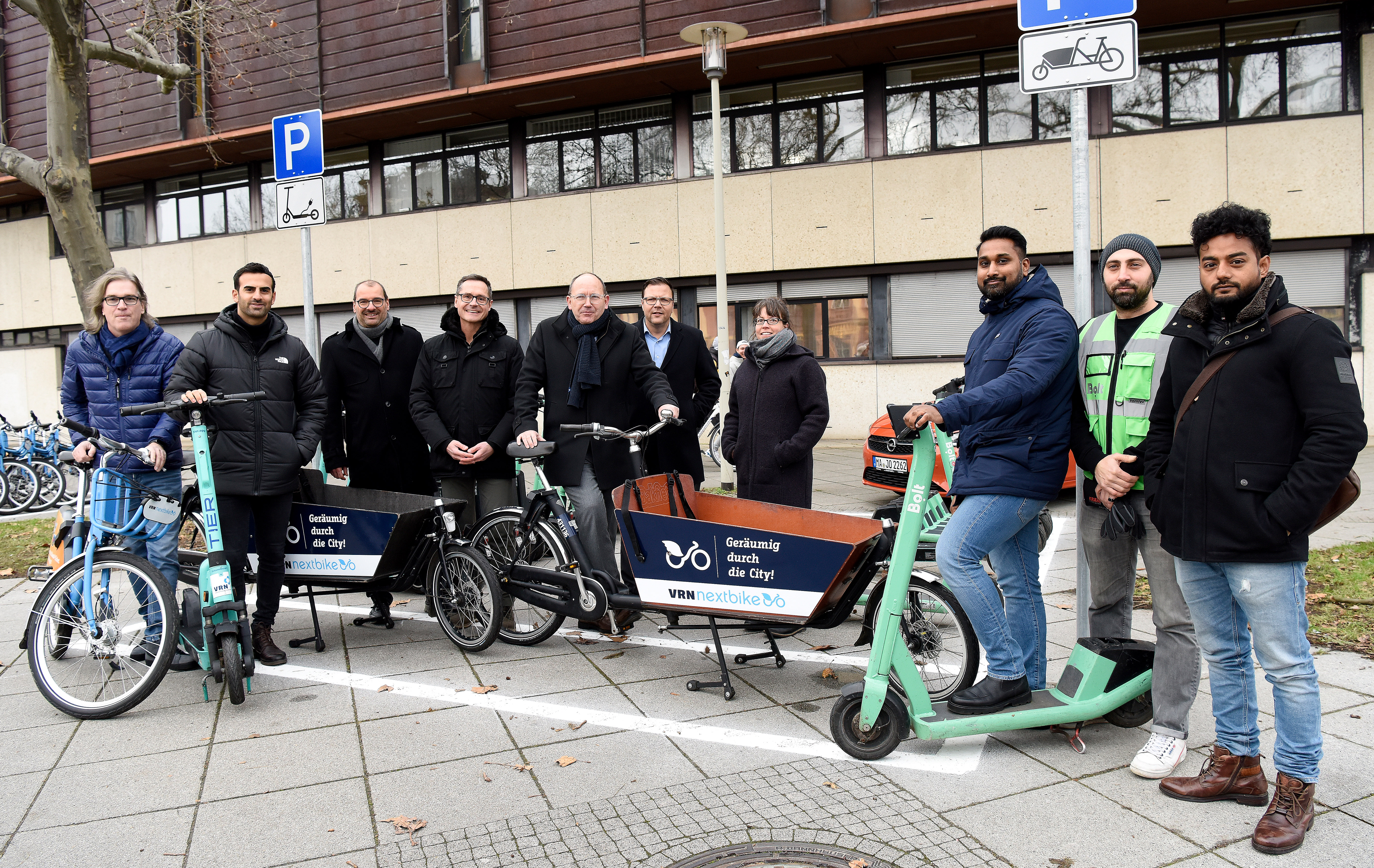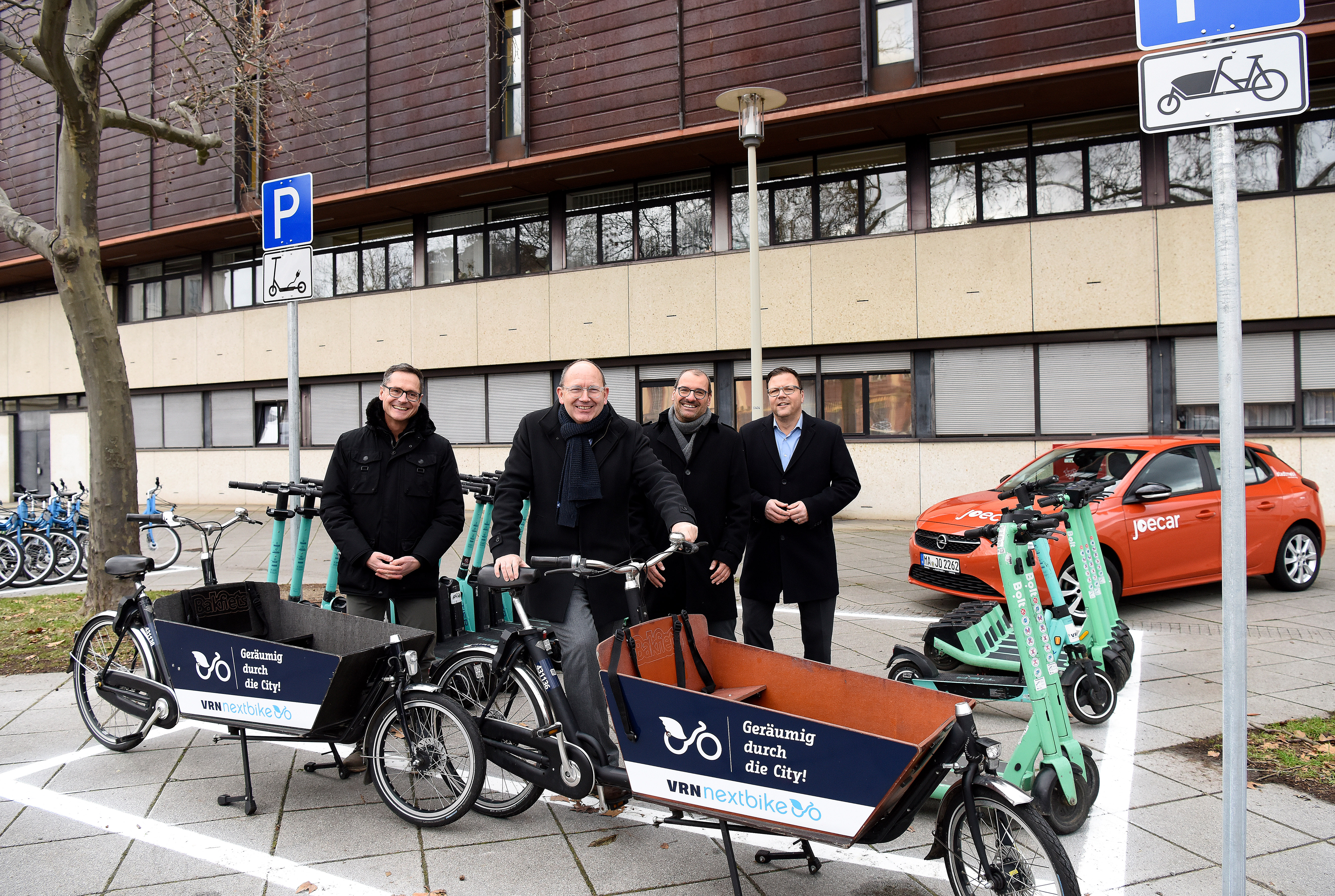Freuen sich gemeinsam über die neue VRN-Mobilstation am Schloss (von links): Verkehrsbürgermeister Ralf Eisenhauer, Oberbürgermeister Christian Specht, Michael Winnes, Geschäftsführer der Verkehrsverbund Rhein-Neckar GmbH (VRN), und ÖPNV-Dezernent Dr. Volker Proffen.