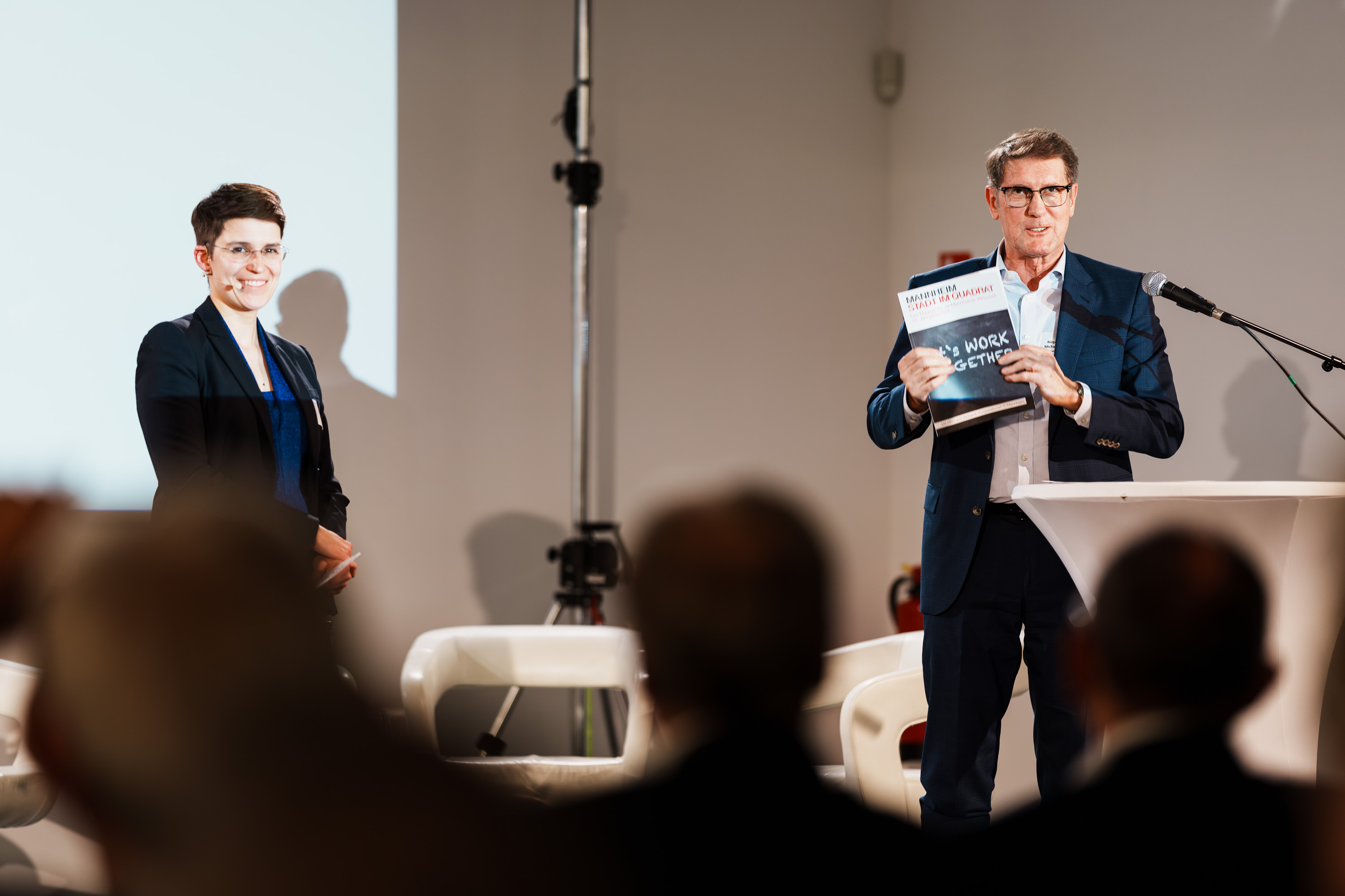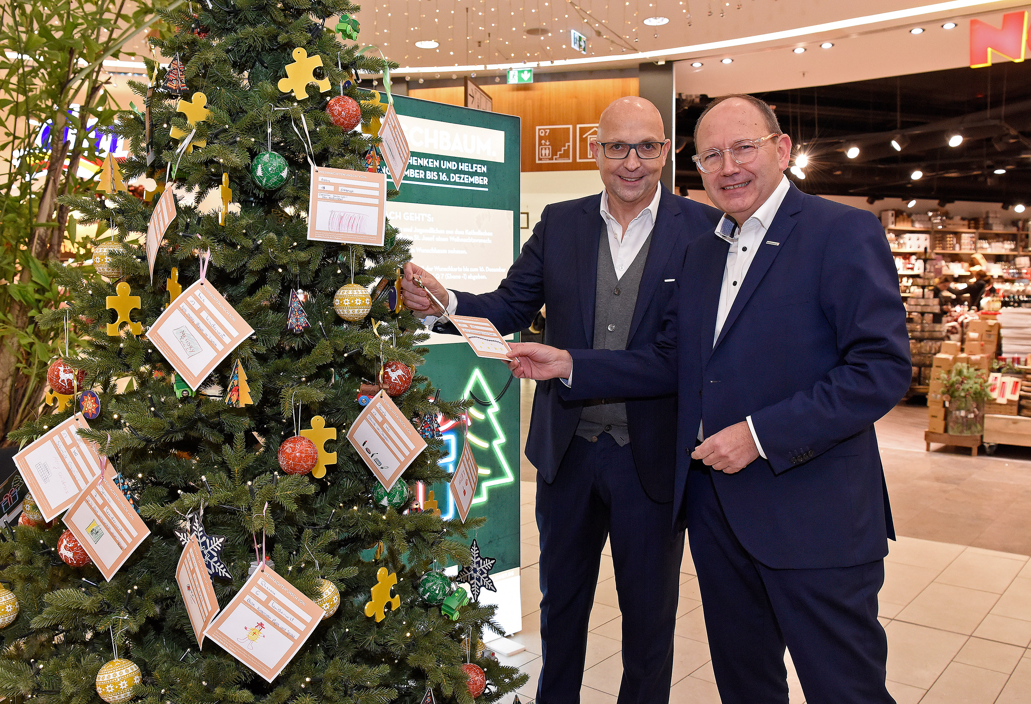 Markus Erhardt, Vizepräsident des Rotaract Clubs Mannheim, Rainer Hartel, Geschäftsführer der Ravensburger Freizeit & Promotion GmbH, Traudl Bellon, Leiterin des Haus St. Agnes des Kath. Kinder- und Jugendheim St. Josef, Mannheims Oberbürgermeister Christian Specht und Quartier-Chef Hendrik Hoffmann (v.l.n.r.) haben die Weihnachtszeit auf dem Münzplatz eingeläutet und die Weihnachtsbeleuchtung eingeschaltet.