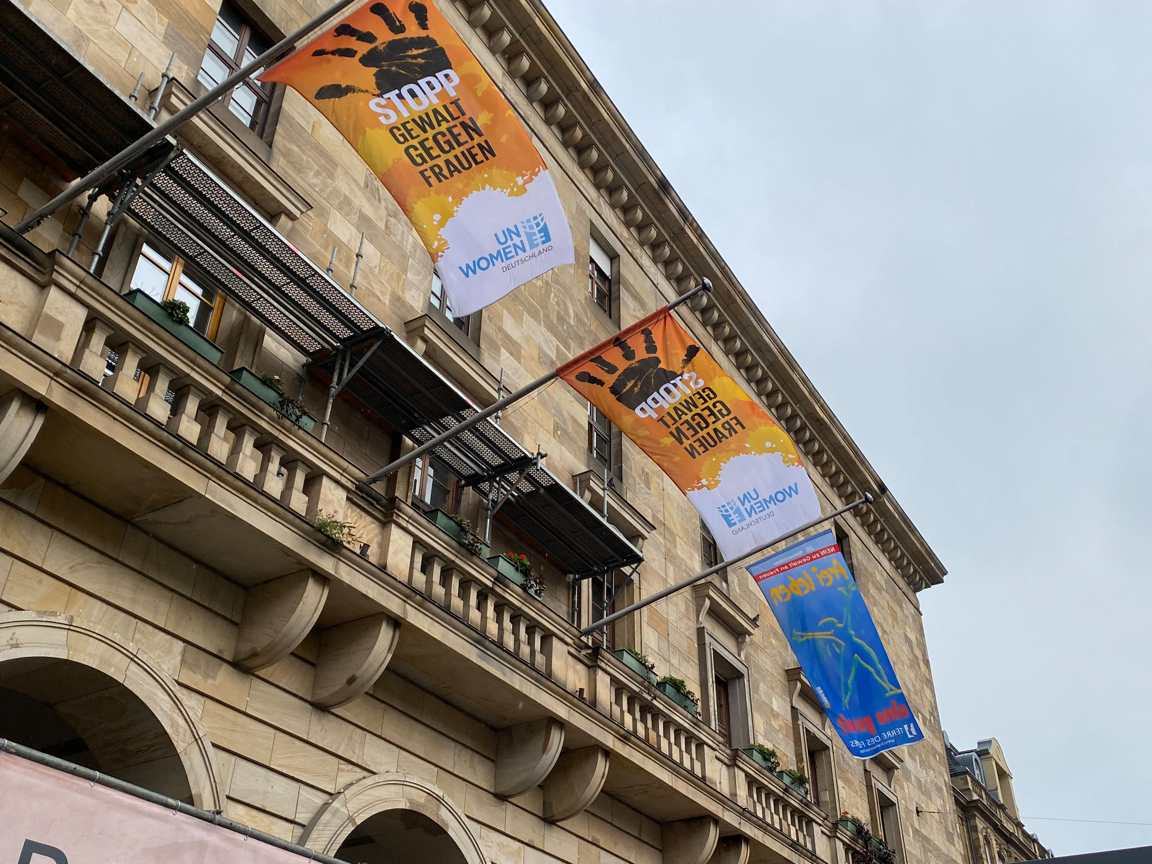 Anlässlich des Tags gegen Gewalt an Frauen 2023 ist das Rathaus mit Fahnen von Terre des Femmes „ Frei leben ohne Gewalt“ und UN Woman Deutschland „Stopp Gewalt gegen Frauen“ beflaggt.