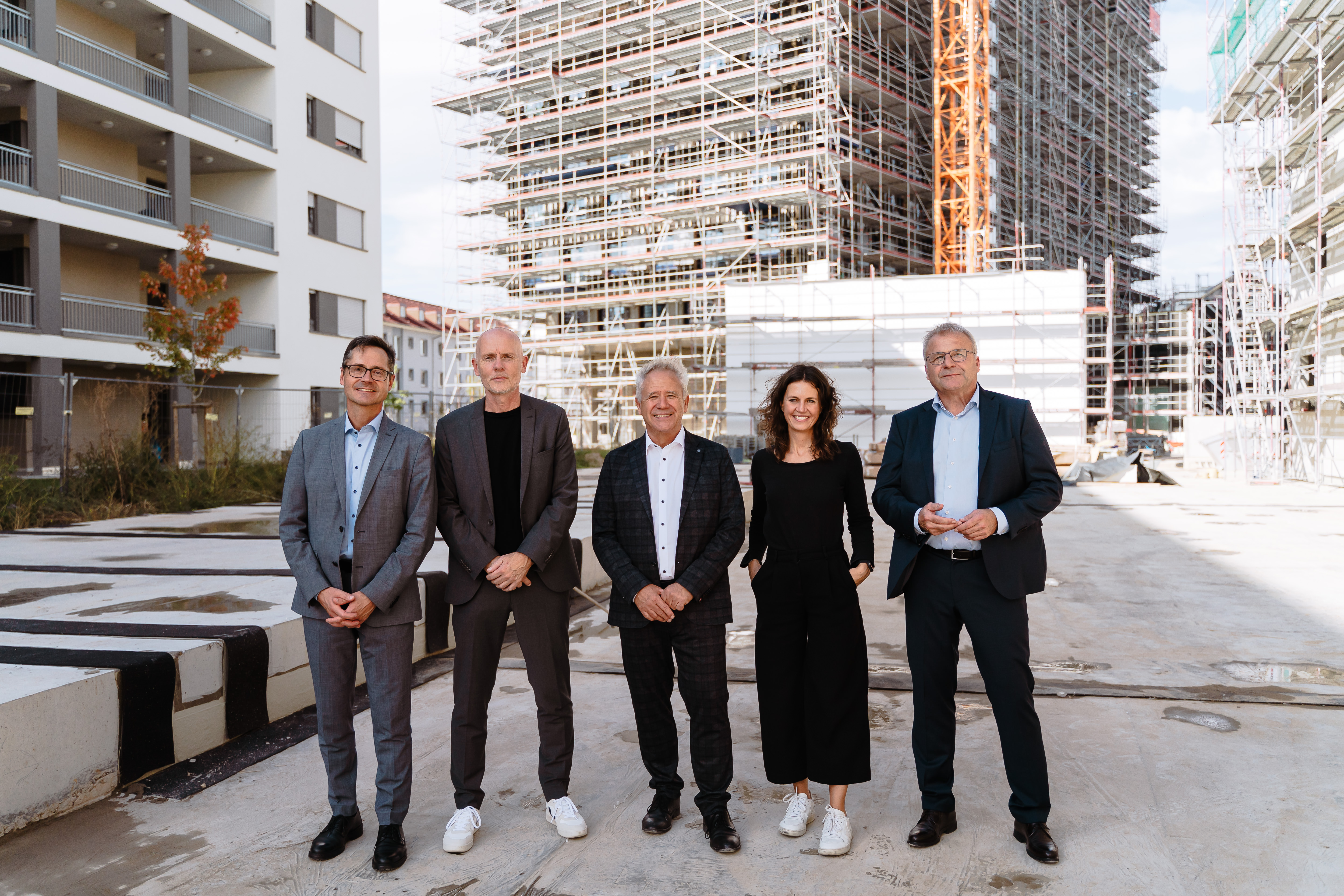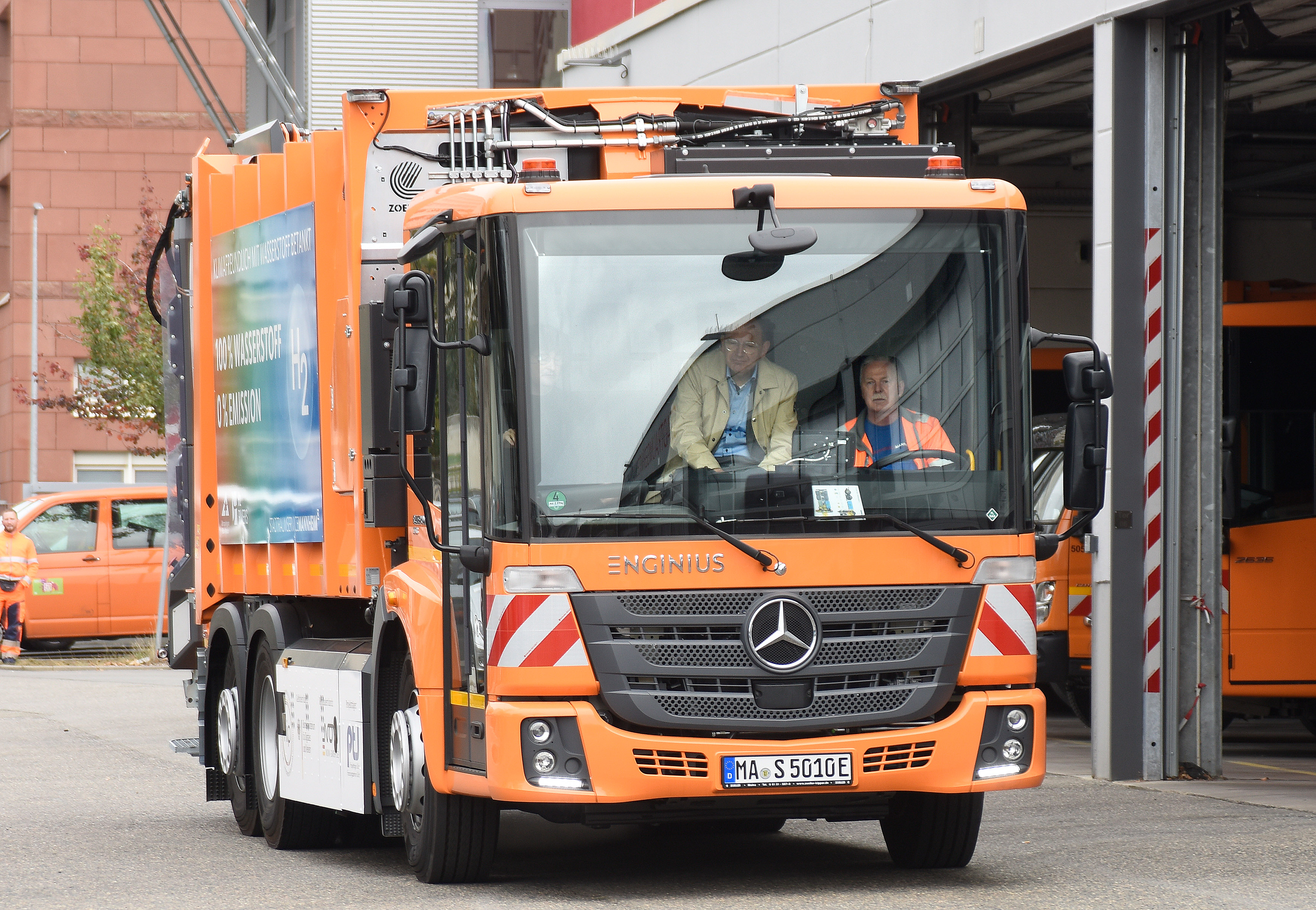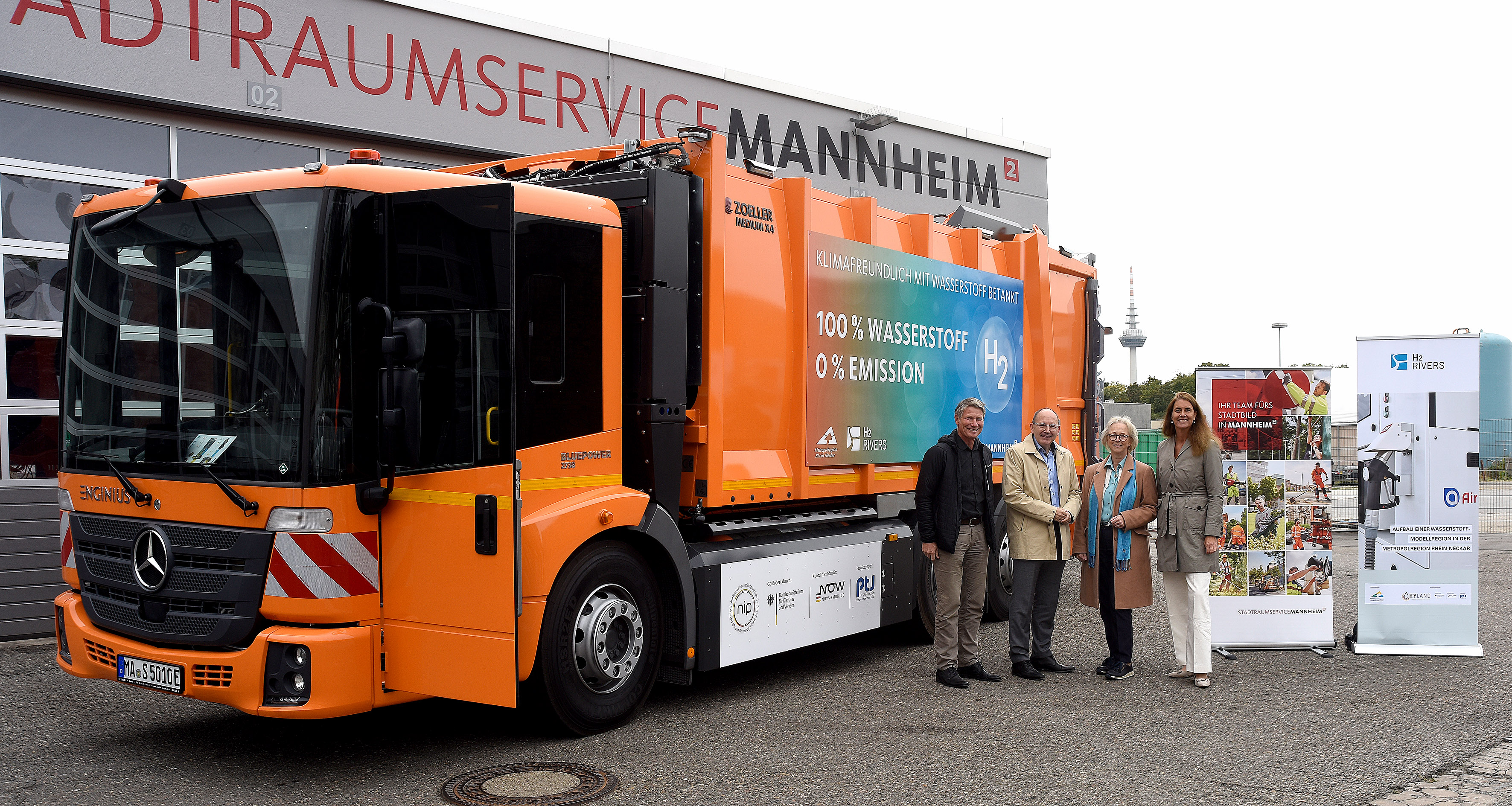Oberbürgermeister Christian Specht (2. v. l.) freut sich gemeinsam mit den Eigenbetriebsleitern des Stadtraumservice Markus Roeingh und Alexandra Kriegel sowie mit Dr. Doris Wittneben (2. v. r.) von der Metropolregion Rhein-Neckar über das neue Wasserstofffahrzeug für die Abfallwirtschaft