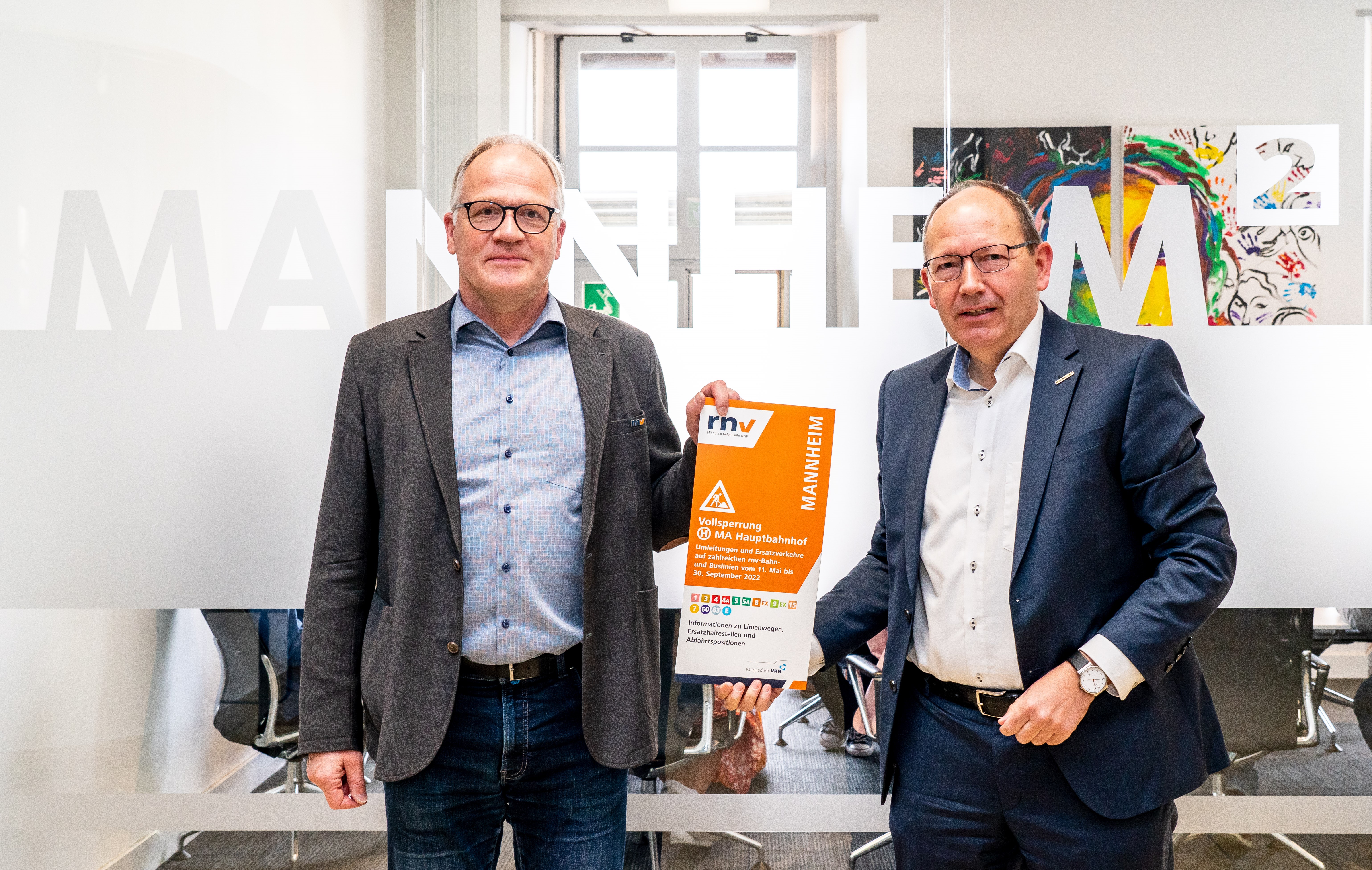 Christian Specht, Erster Bürgermeister und ÖPNV-Dezernent der Stadt Mannheim, und Franz-Wilhelm Coppius, Betriebsleiter der Rhein-Neckar-Verkehr GmbH, bei der Präsentation des Umleitungskonzepts für die anstehende Sperrung der Haltestelle Mannheim Hauptbahnhof.