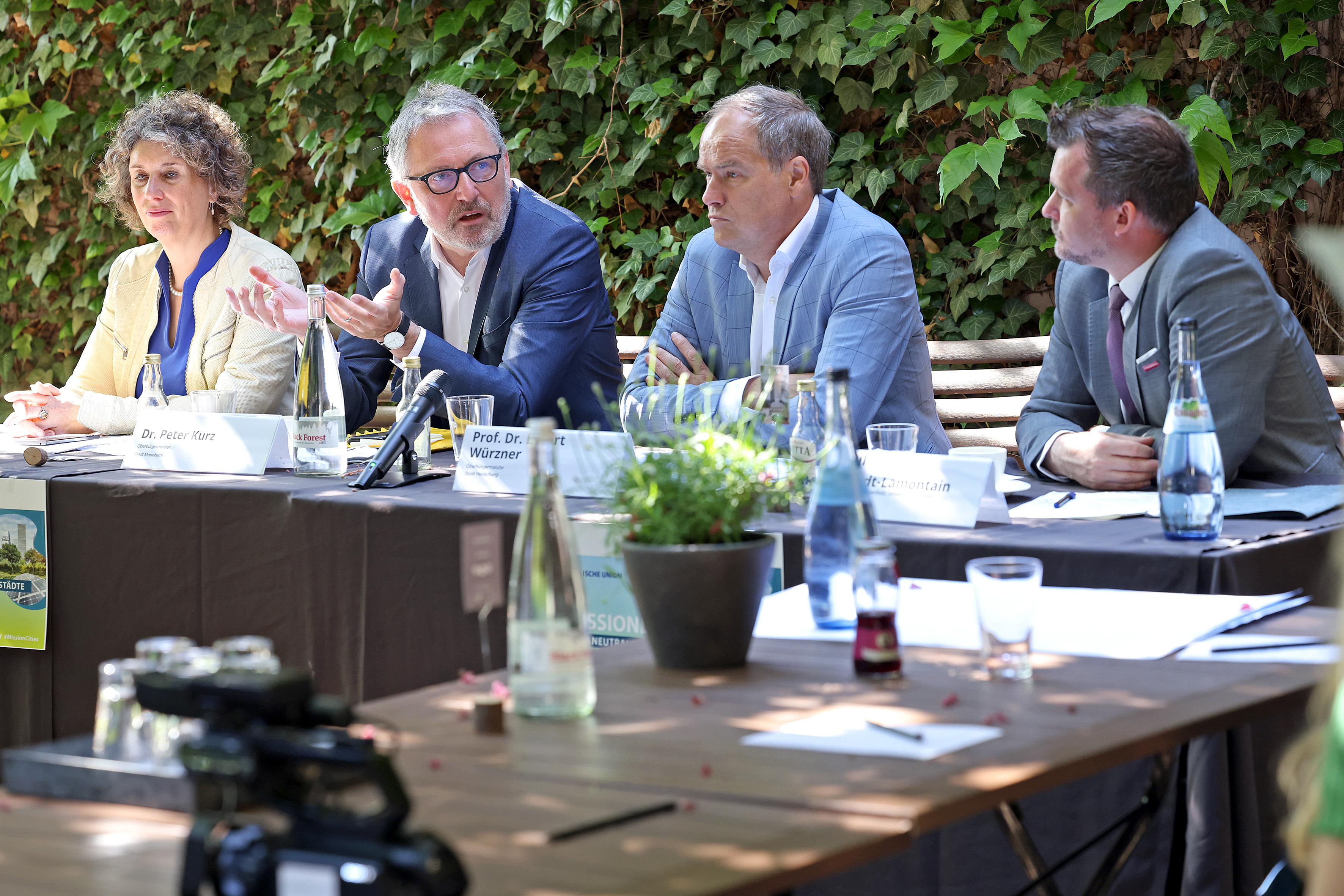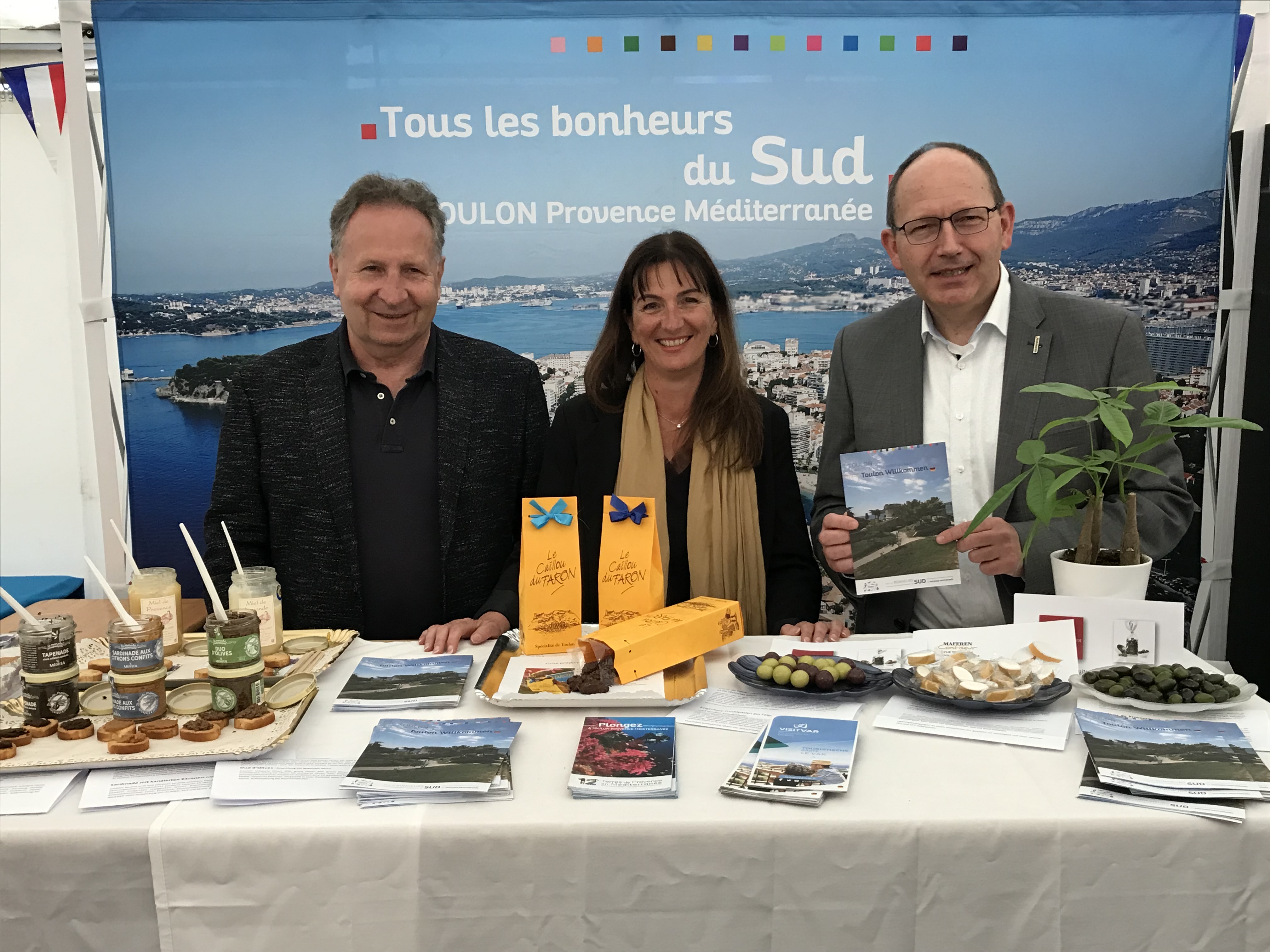 Laurent Jerome, stellvertretender Bürgermeister der Stadt Toulon, und Magali Turbatte, stellvertretende Bürgermeisterin der Mannheimer Partnerstadt Toulon gemeinsam mit dem Ersten Bürgermeister Christian Specht beim Besuch des französischen Markts auf den Kapuzinerplanken.
