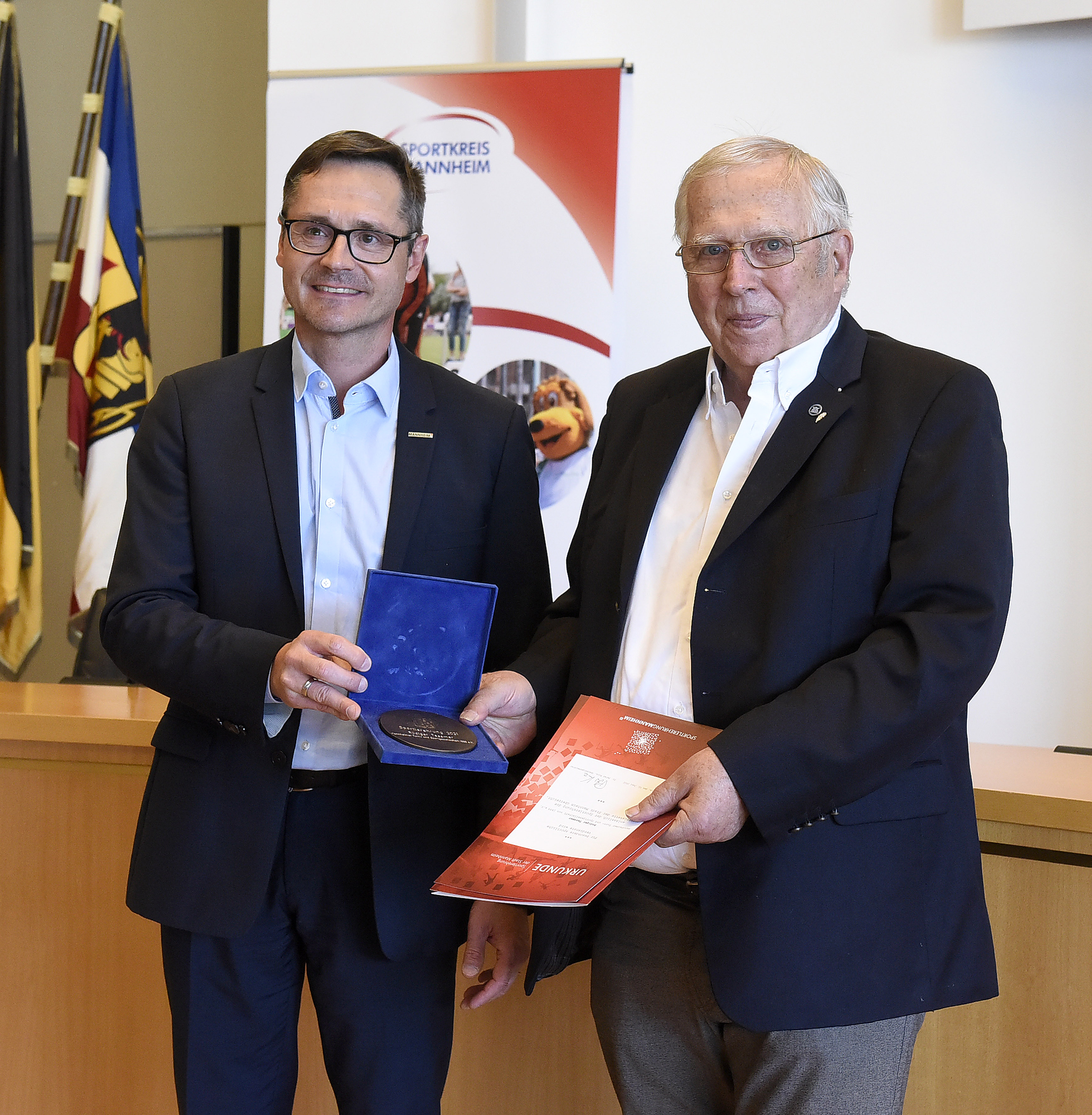 Sportbürgermeister Ralf Eisenhauer (links) und Dr. Sabine Hamann, Vorsitzende des Sportkreises Mannheim e.V. mit Oliver Upmann (1. Mannheimer Judo-Club e.V.), dem Sportler des Jahres 2021.
