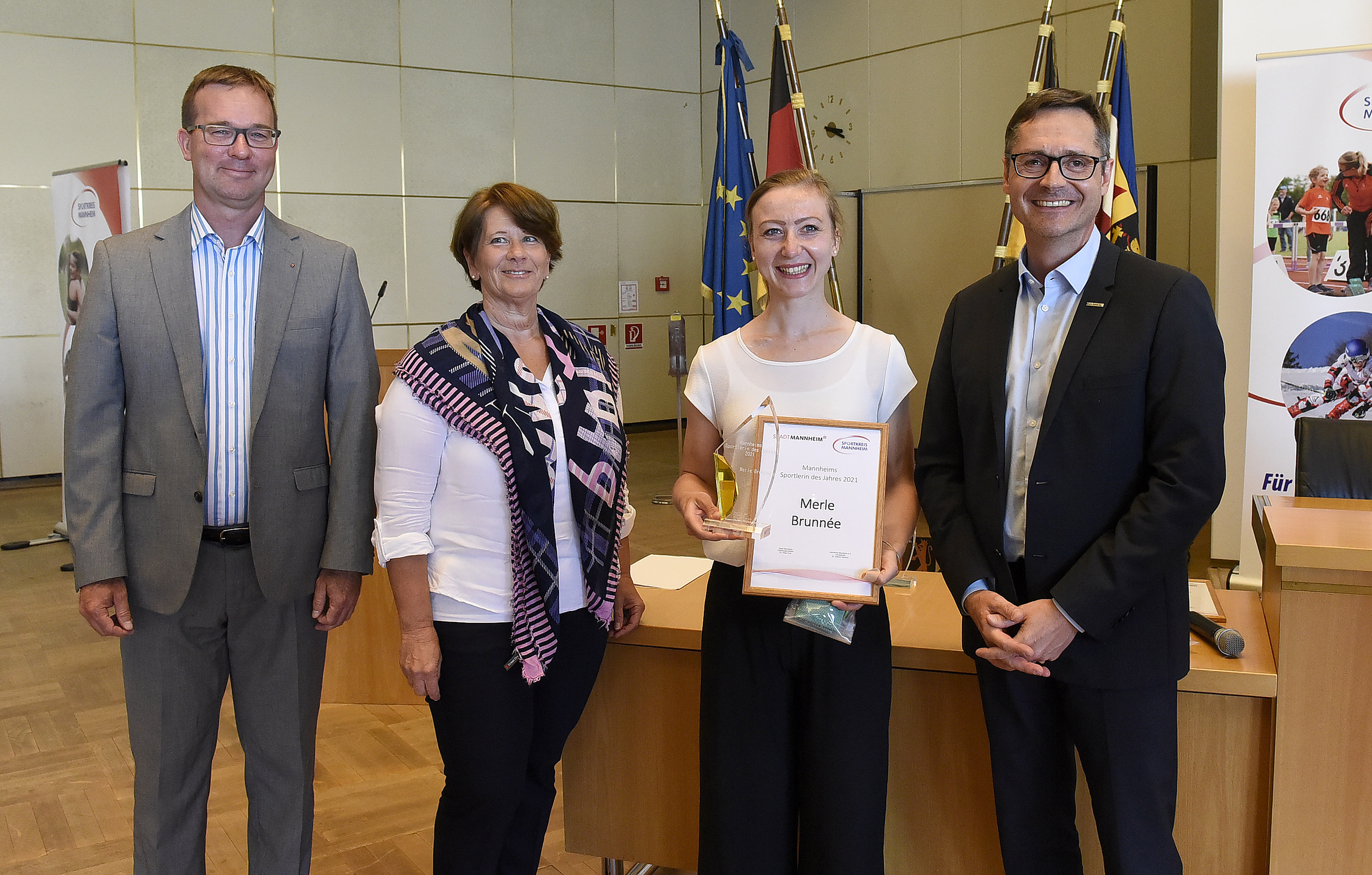 Uwe Kaliske, Leiter des Fachbereichs Sport und Freizeit, Dr. Sabine Hamann, Vorsitzende des Sportkreises Mannheim e.V. und Sportbürgermeister Ralf Eisenhauer (rechts) zeichneten Merle Brunée (Mannheimer Turn- und Sportgesellschaft 1899 e.V., 2.v.r.) als Sportlerin des Jahres 2021 aus.