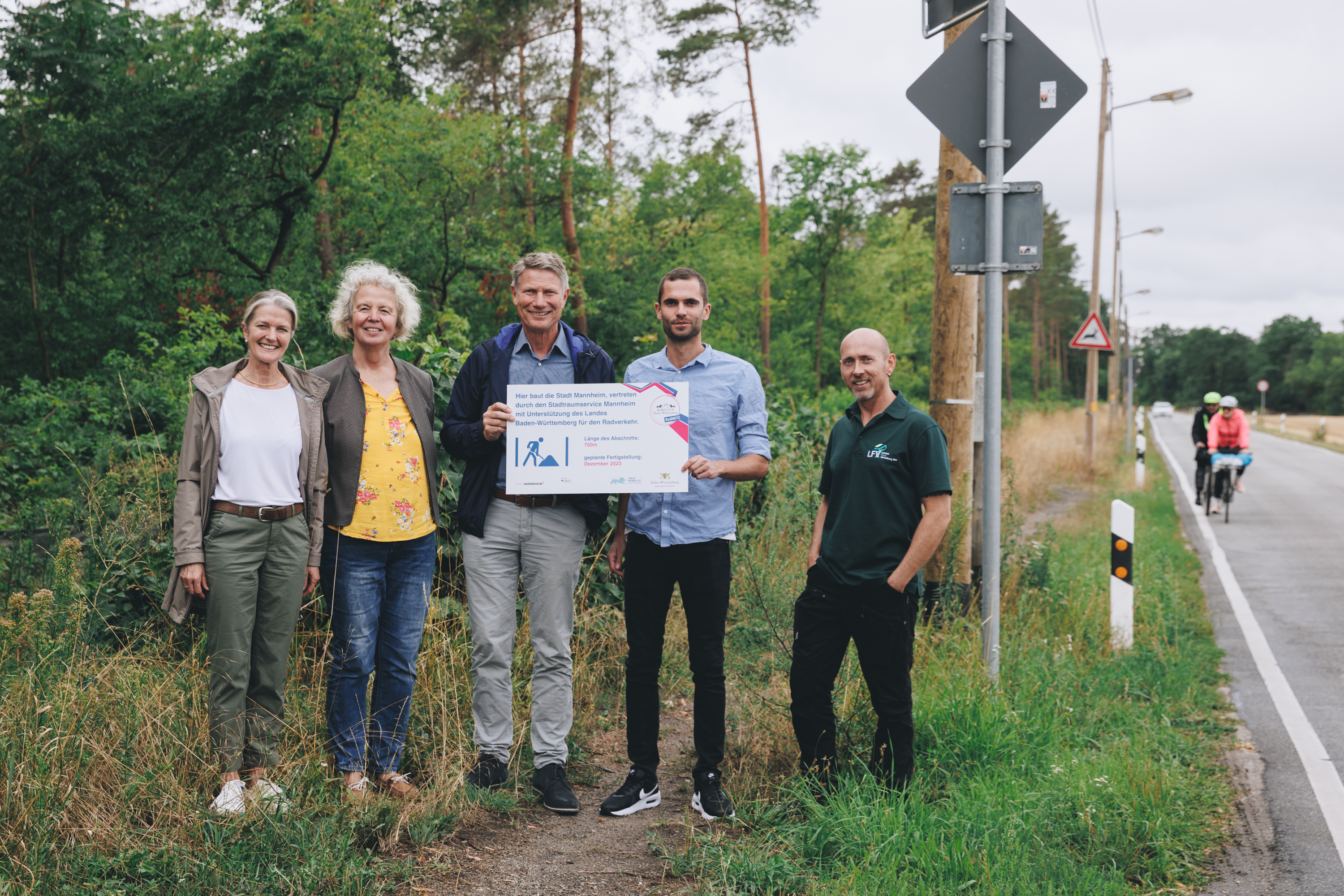 von links: Elternbeiratsvorsitzende Alexandra von Gropper, Rektorin Silvia Challal, Eigenbetriebsleiter Stadtraumservice Mannheim Markus Roeingh, Projektleiter Stadtraumservice Mannheim Björn Mistele sowie Revierleiter Forst und Stadtwald Marko Kratz