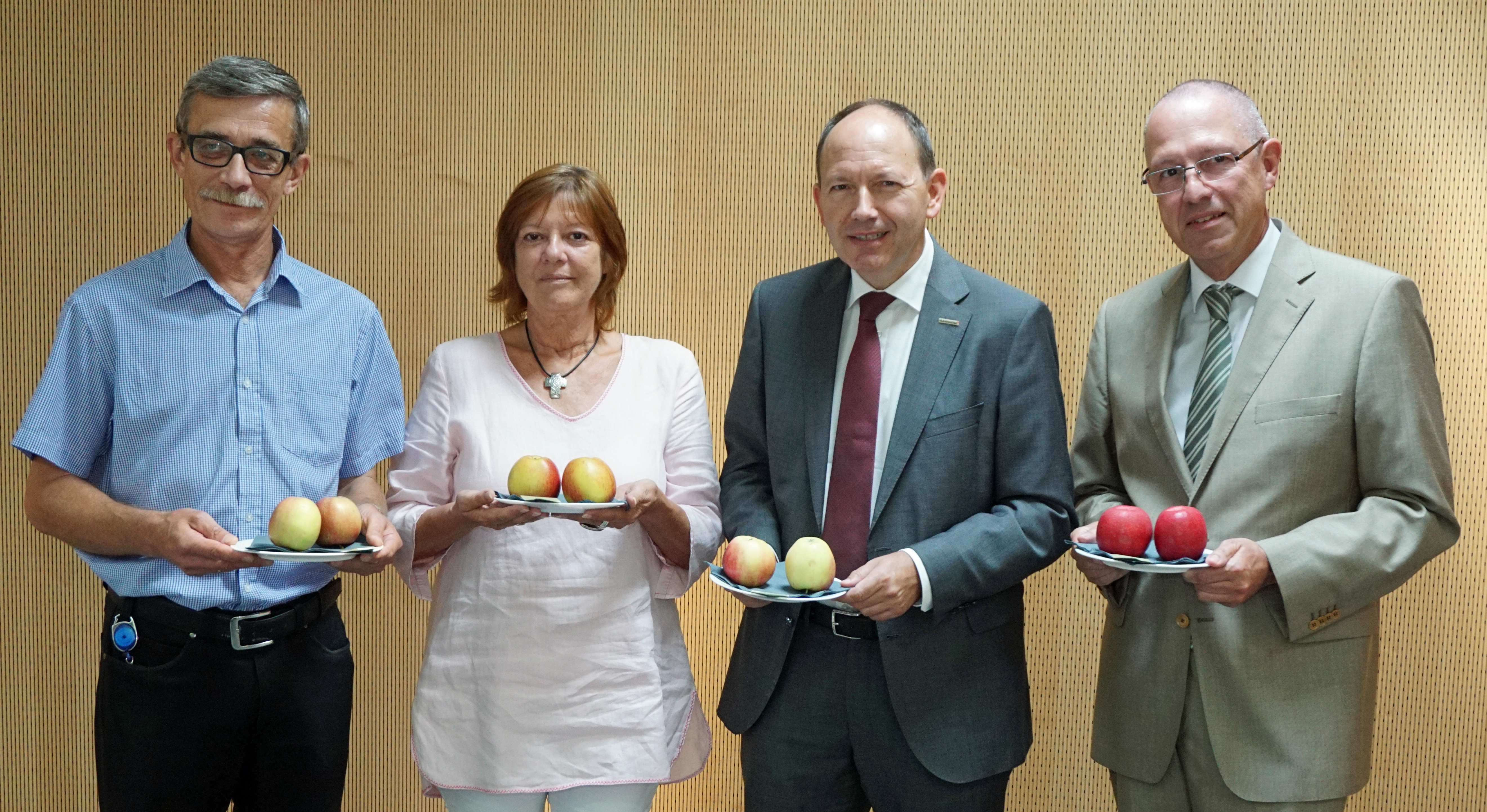 Erster Bürgermeister Christian Specht (2.v.r.) präsentiert mit Peer-Kai Schellenberger (r.), Leiter Abteilung Verbraucherschutz, und seinen Mitarbeitern verschiedene Äpfel. Welche stammen aus Deutschland, welche sind Importware?