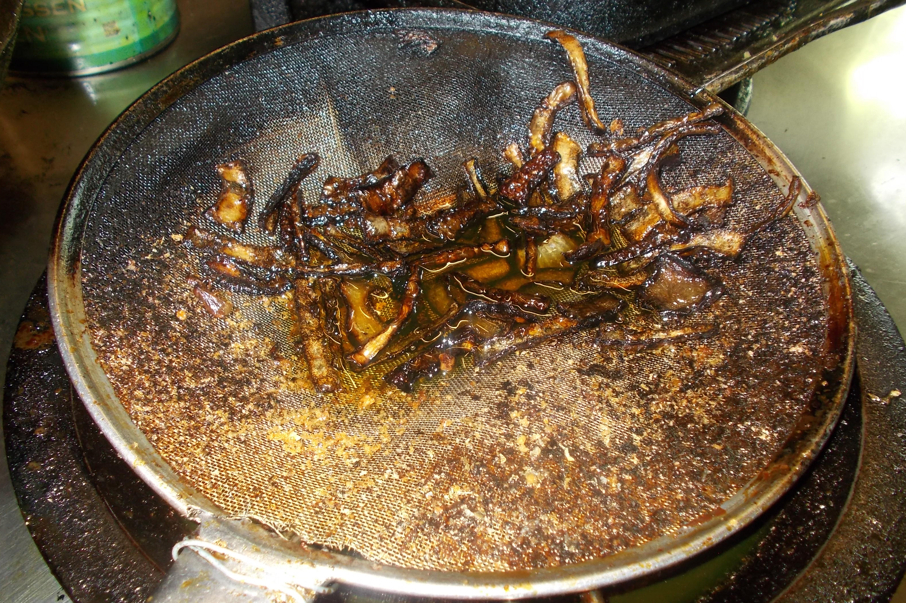 Pommes in einem verdreckten Sieb