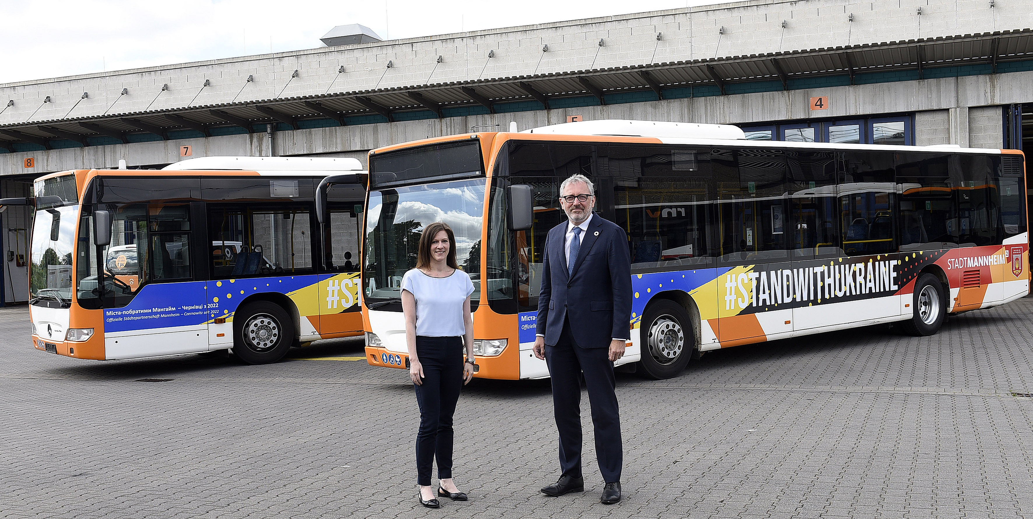 Oberbürgermeister Dr. Peter Kurz sowie Stefanie Miller vom Fachbereich Internationales, Europa und Protokoll vor der Abfahrt der Busse nach Czernowitz