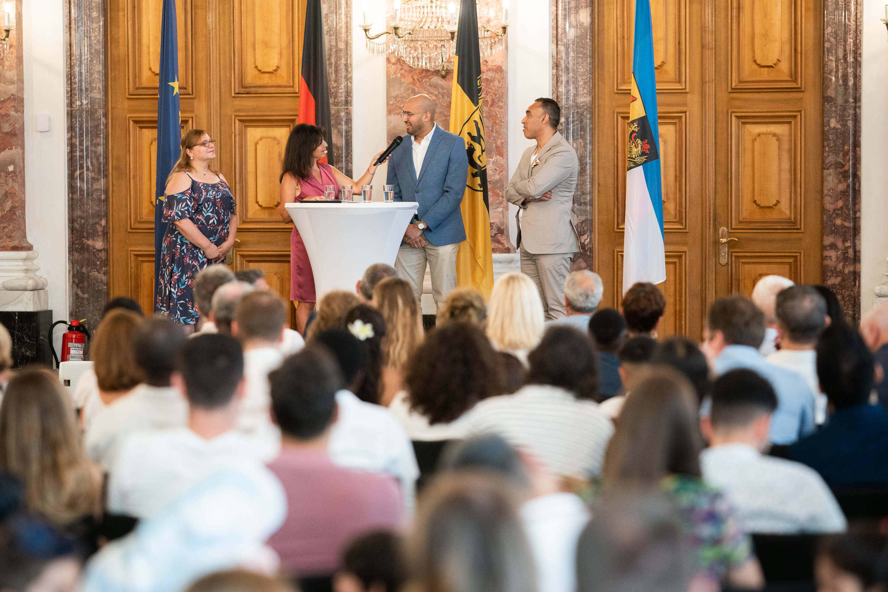 Moderatorin der Einbürgerungsveranstaltung Rosa Omenaca Prado und die Teilnehmenden der Talkrunde Maria Perri, Abdalla Gdoura, Muhammad Shoaib Ahmed Jalili