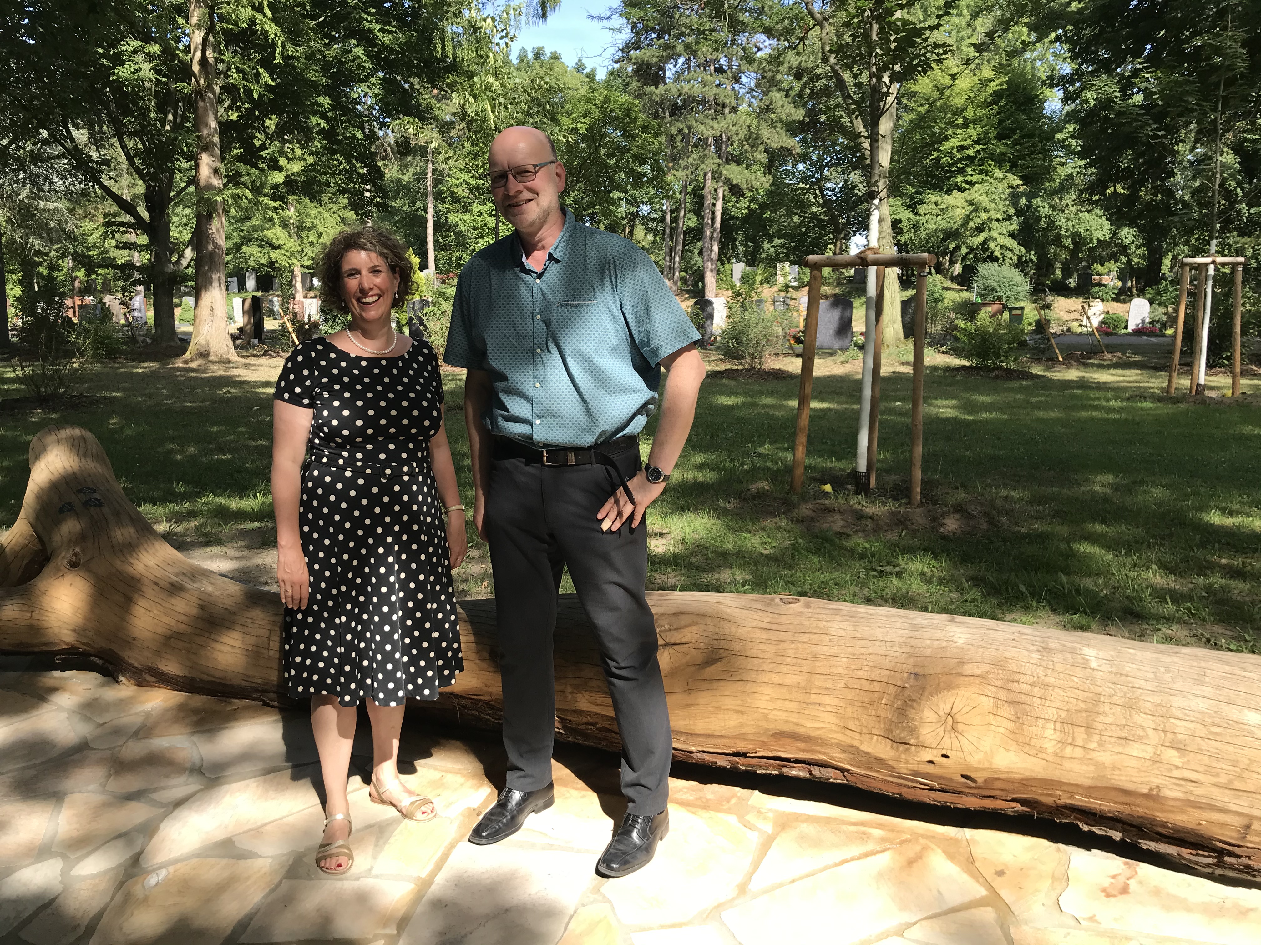 Bürgermeisterin Prof. Dr. Diana Pretzell und Eigenbetriebsleiter der Friedhöfe Andreas Adam vor dem neuen Baumgrabfeld auf dem Friedhof in Käfertal