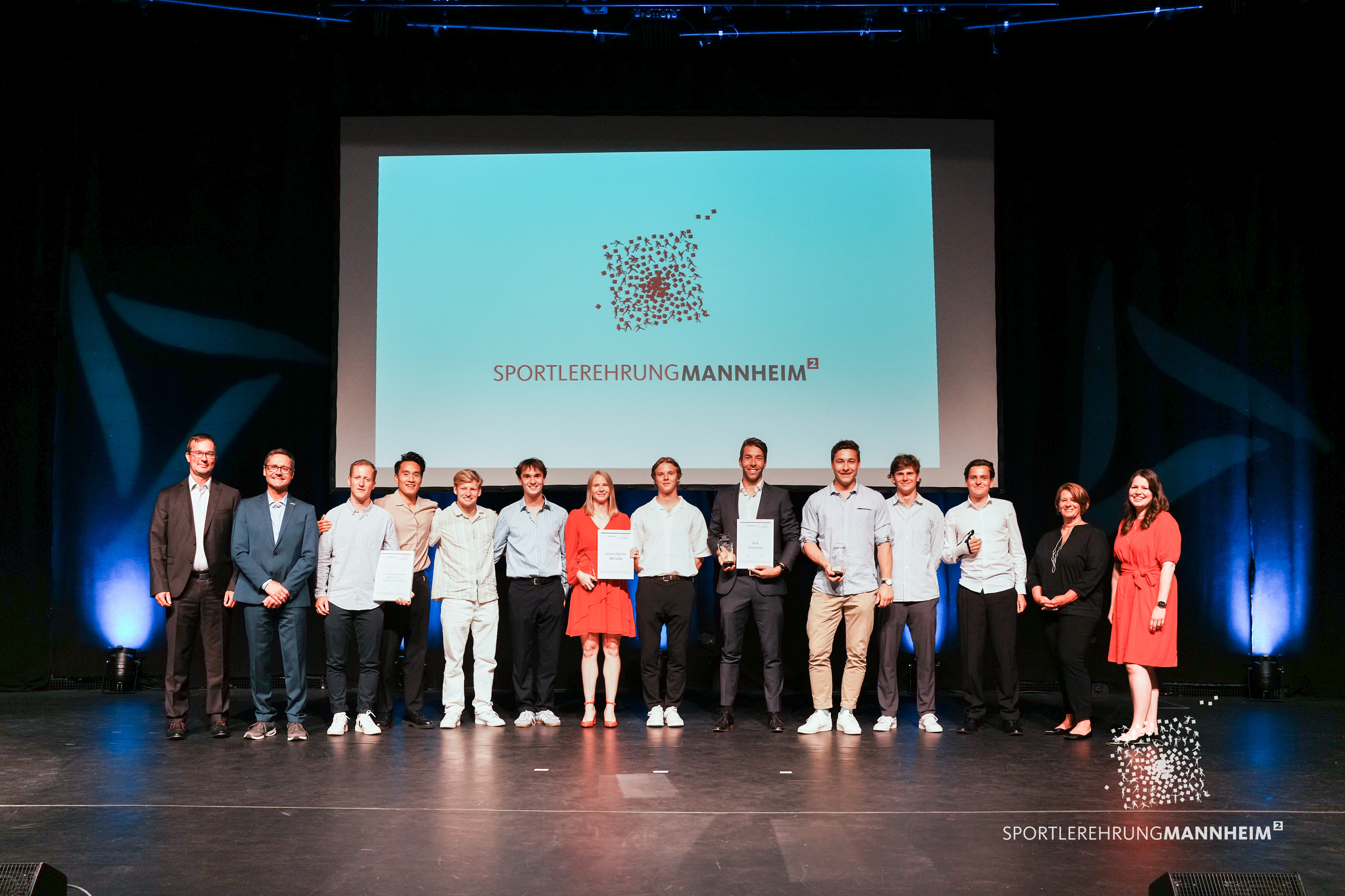 Die Geehrten, Sportlerin des Jahres 2022 Jessica-Bianca Wessoly, Sportler des Jahres 2022 Nick Trinemeier und die erste Herrenmannschaft Mannheimer Hockeyclub 1907 e.V mit Sportbürgermeister Ralf Eisenhauer.