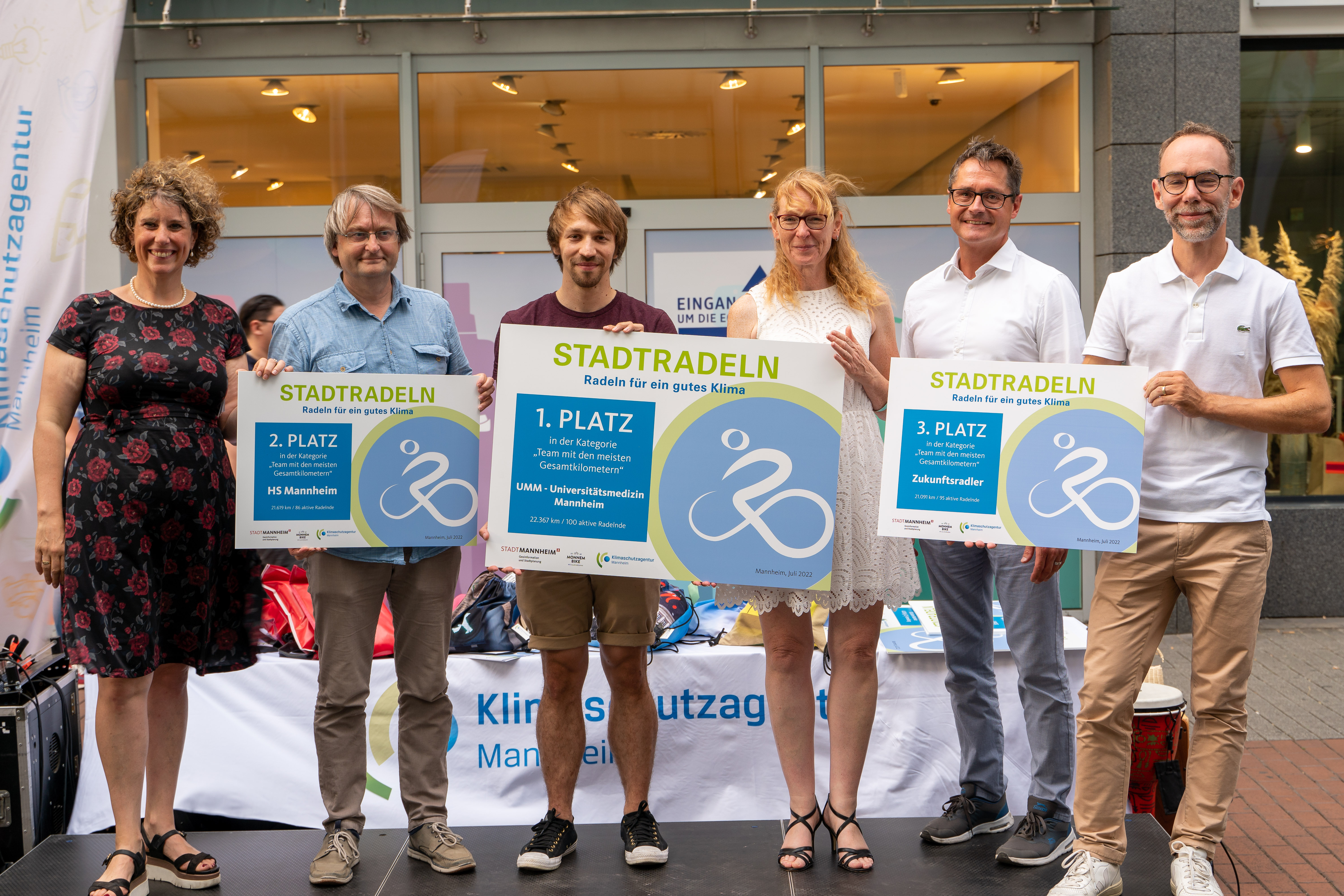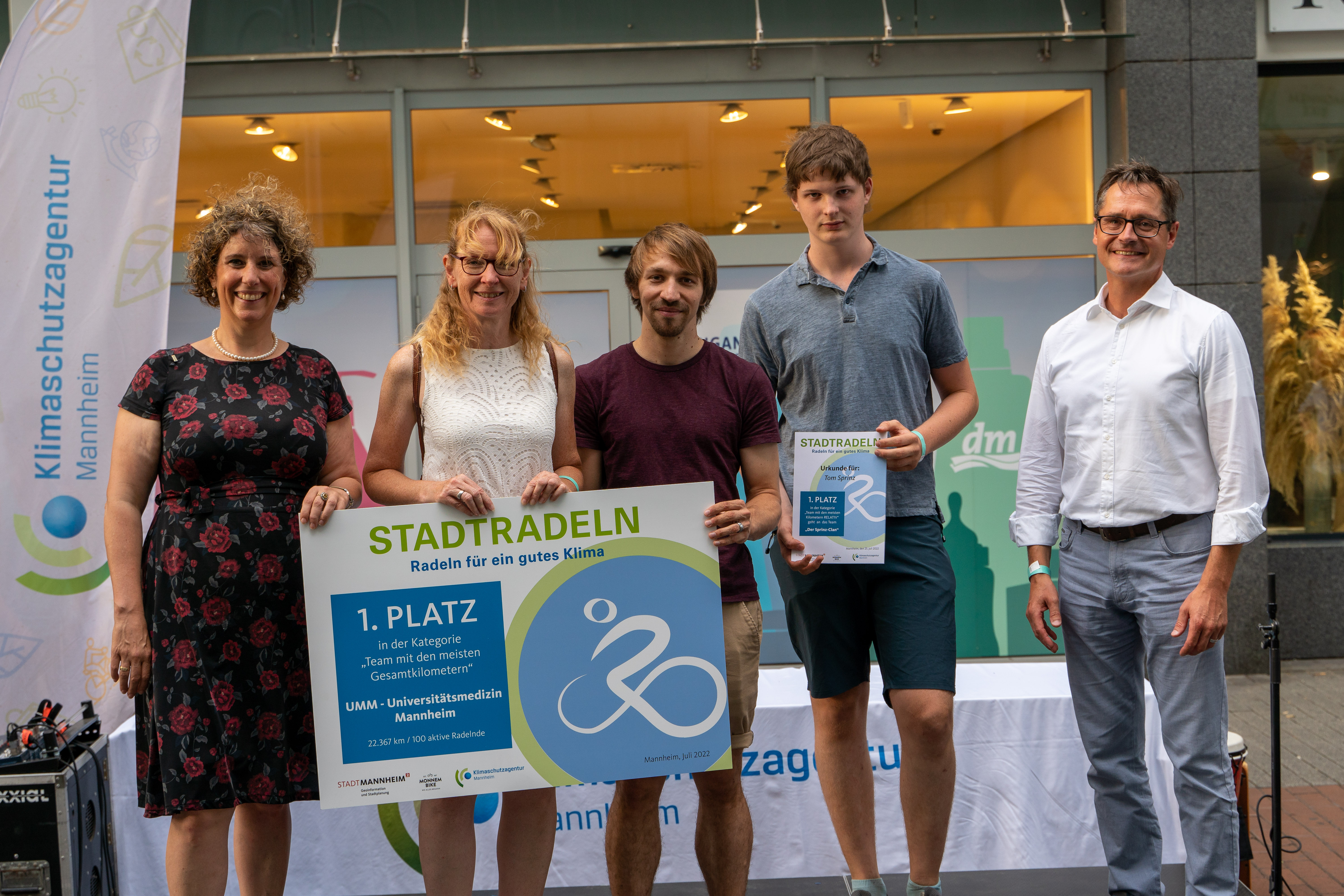 Bürgermeisterin Prof. Dr. Diana Pretzell (links) und Bürgermeister Ralf Eisenhauer (rechts) mit den Gewinnern von STADTRADELN 2022: In der Kategorie „Radelaktivstes Team mit den meisten Kilometern ABSOLUT“ das Team des „Universitätsklinikums Mannheim“ und in der Kategorie „Team mit den meisten Kilometern RELATIV" das zweiköpfige Team „Der Sprinz-Clan".