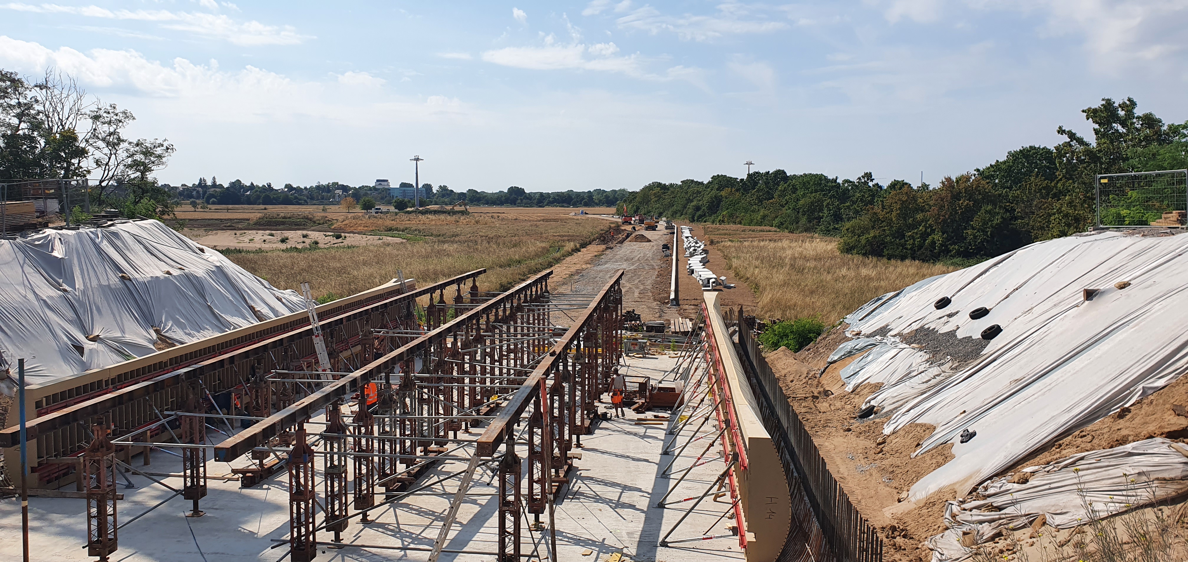 Der Radschnellweg Mannheim-Viernheim-Weinheim führt am Rande der Feudenheimer Au und über das Buga-Gelände Richtung Franklin. Die Arbeiten durch die Bundesgartenschau Mannheim 2023 gGmbH haben bereits begonnen. Auf dem Bild zu sehen ist der Bau der Unterführung unter der Straße Am Aubuckel.