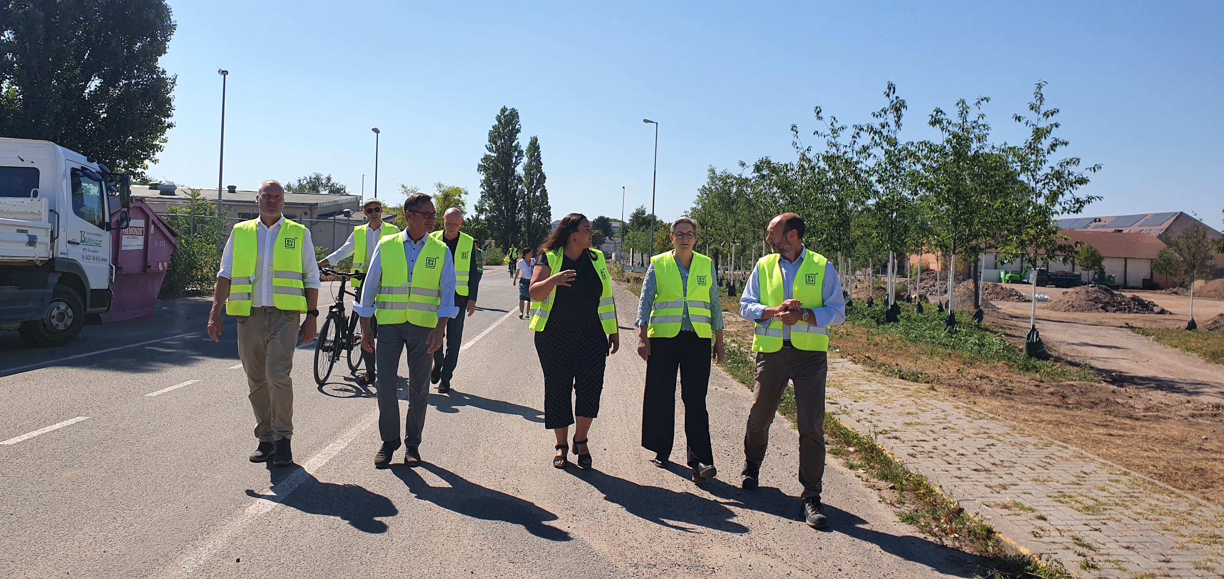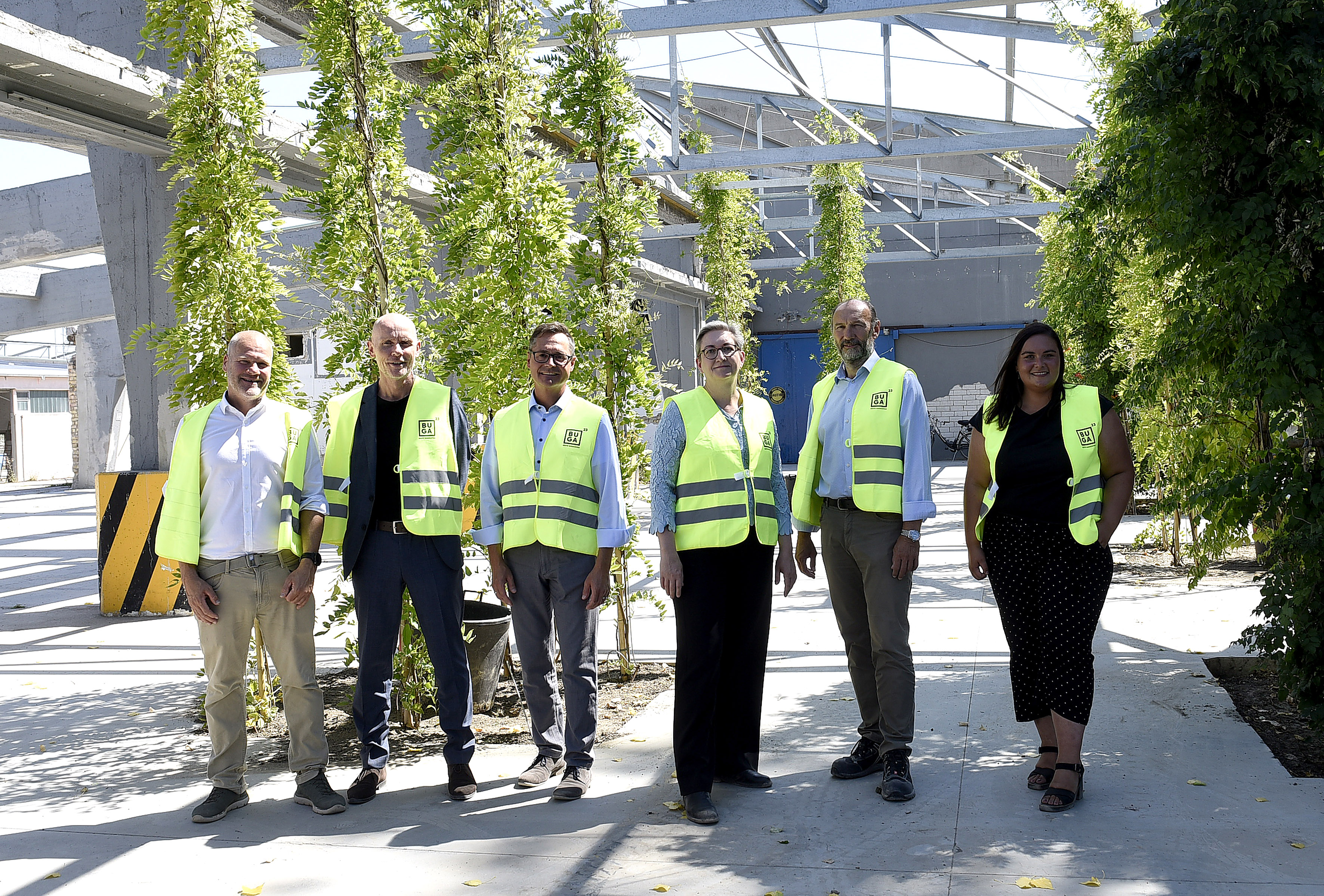 Informierten sich über den Fortschritt auf dem BUGA-Gelände (von link): Klaus-Jürgen Ammer (Beauftragter Konversion & Leiter Projektgruppe Konversion bei der Stadt Mannheim), Achim Judt (Geschäftsführer MWSP), Ralf Eisenhauer (Baubürgermeister Stadt Mannheim), Klara Geywitz (Bundesministerin für Wohnen, Stadtentwicklung und Bauwesen), Michael Schnellbach (Geschäftsführer BUGA 23 gGmbh) und Isabel Cardematori (MdB).