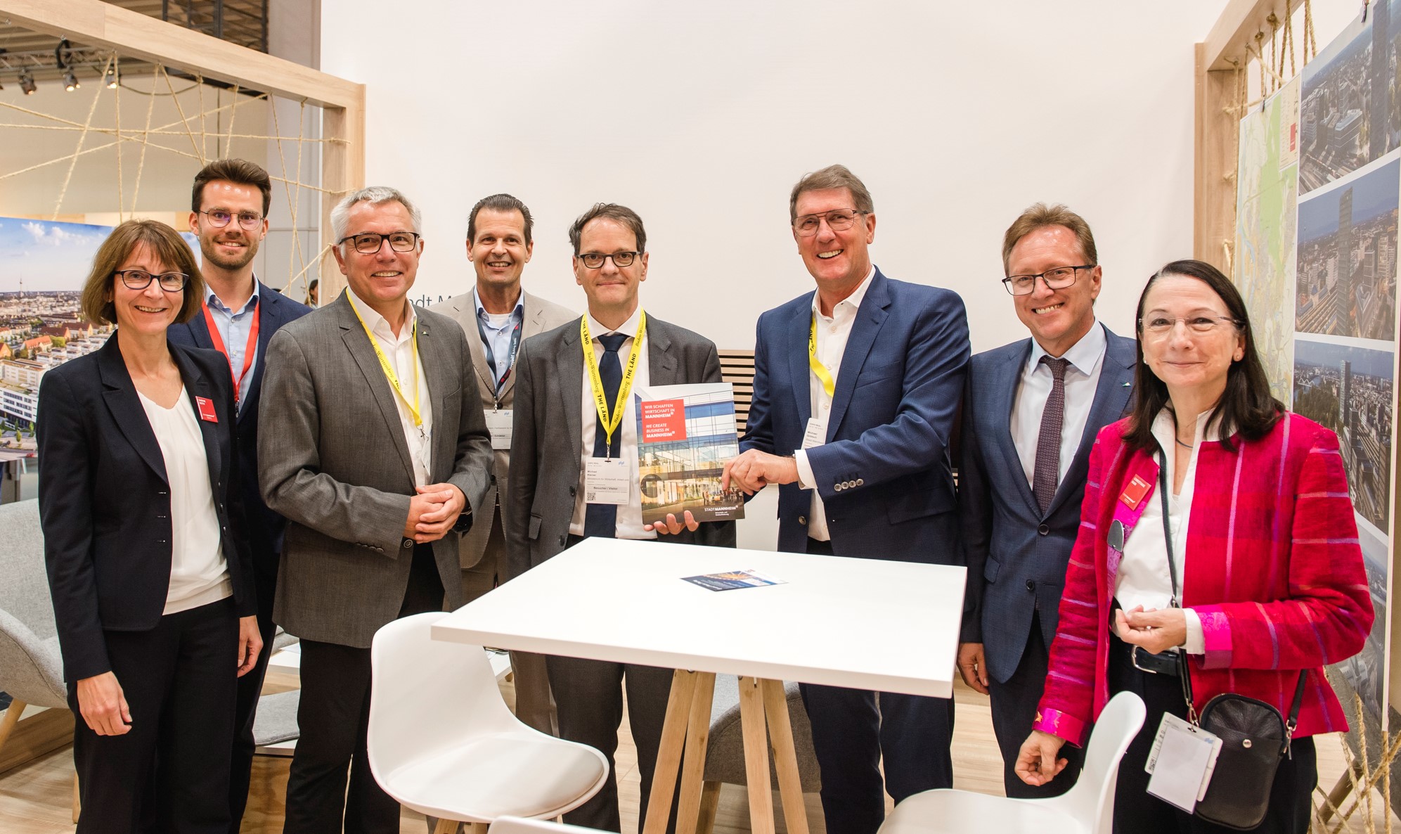 Manfred Holz, Ehrenbotschafter Fairtrade Deutschland e.V. (rechts) überreicht die Urkunde »10 Jahre Fairtrade-Town« an Oberbürgermeister Dr. Peter Kurz und den Steuerungskreis Fairtrade-Town Mannheim.