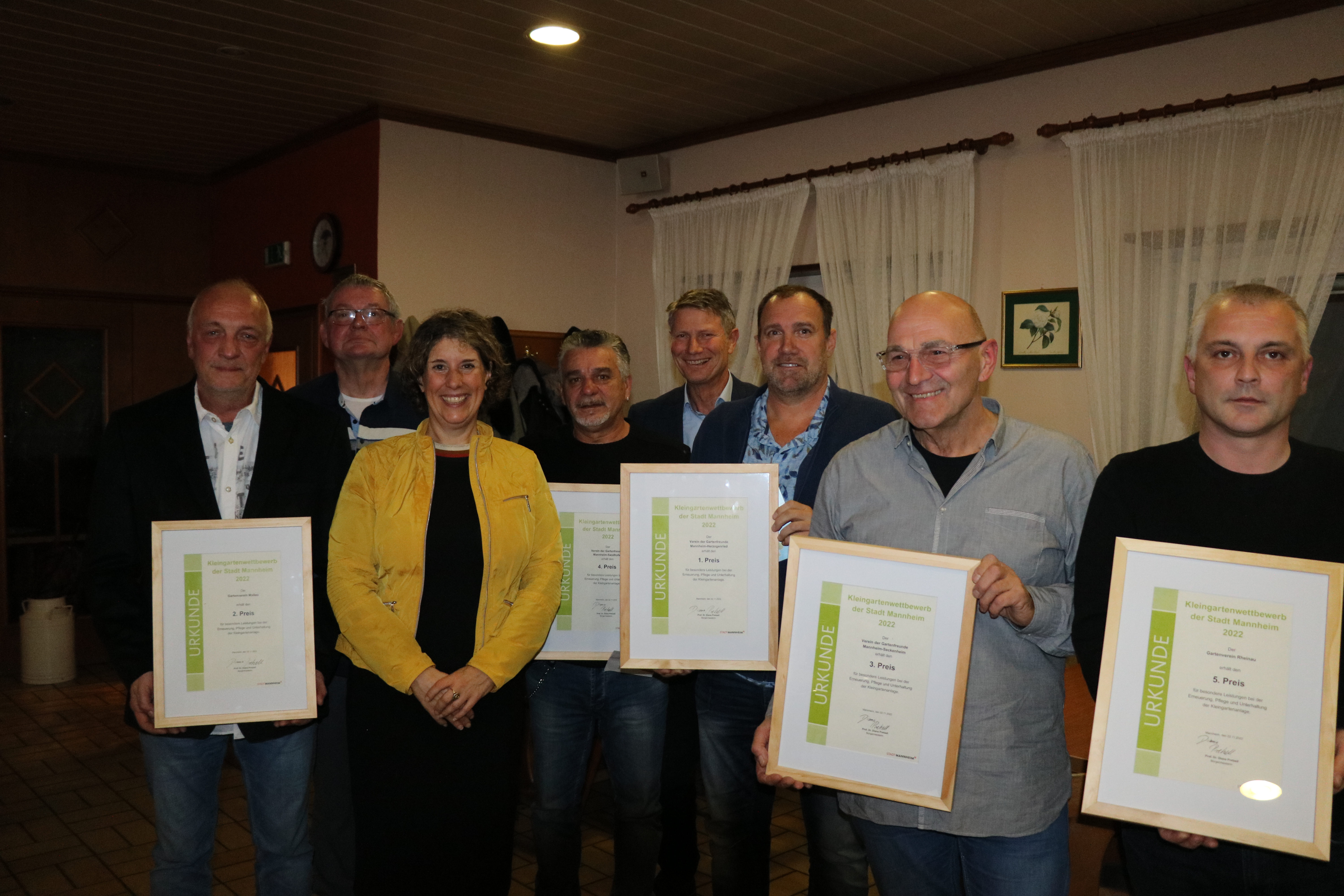 v.l.n.r.: Peter Stier, 1. Vorsitzender des Gartenvereins Mallau, Helmut Losert, Vorsitzender des Bezirksverbands der Gartenfreunde Mannheim, Bürgermeisterin Prof Dr. Diana Pretzell, Gaetano Allegra, 1. Vorsitzender der Gartenfreunde Sandhofen, Eigenbetriebsleiter Stadtraumservice Markus Roeingh, Bernd Hartmann, 1. Vorsitzender der Gartenfreunde Herzogenried, Dieter Albrecht, Schriftführer des Vereins der Gartenfreunde Mannheim-Seckenheim und Peter Keller, Schriftührer des Gartenvereins Rheinau