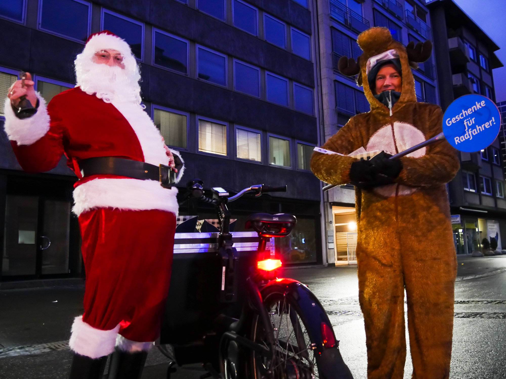 Der städtische Verkehrs-Nikolaus belohnt Radfahrende mit funktionierender Beleuchtung mit einem Schoko-Herz.