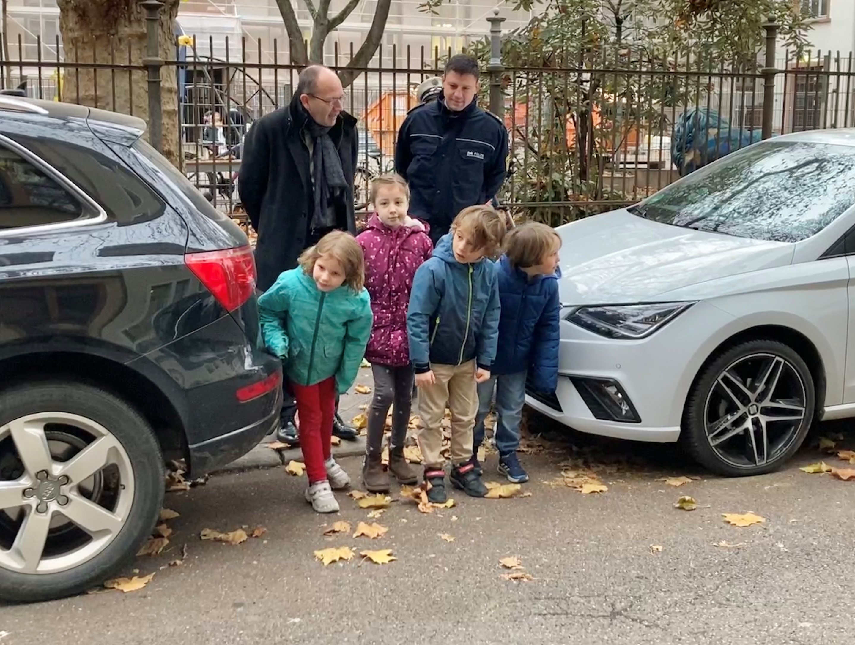Erstklässler üben mit Polizei und Erstem Bürgermeister Specht das Überqueren der Straße zwischen geparkten Autos.