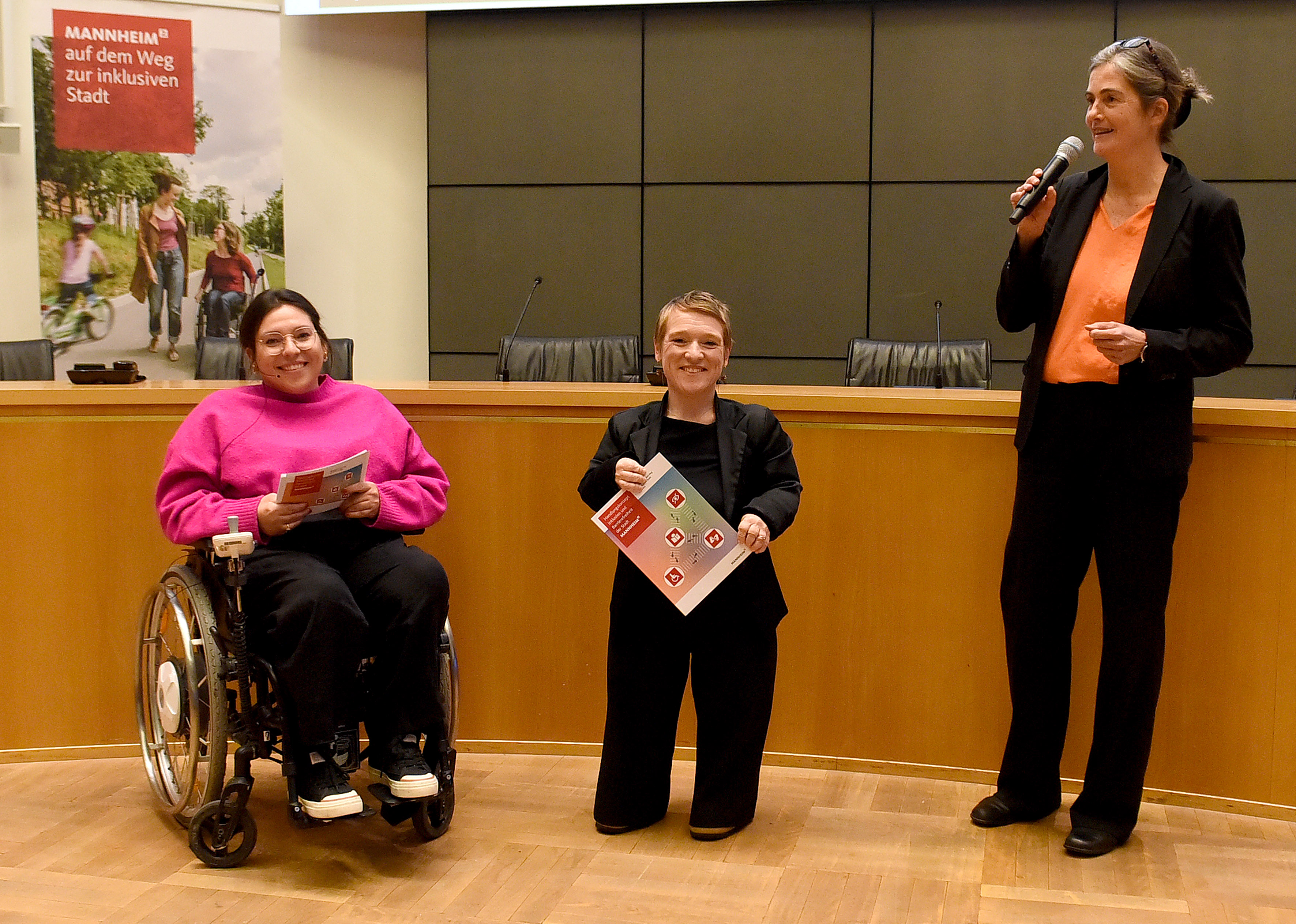 Kim Lumelius, Moderatorin, Simone Fischer, Landesbeauftragte für die Belange von Menschen mit Behinderung und Ursula Frenz, Beauftragte für die Belange von Menschen mit Behinderung der Stadt Mannheim