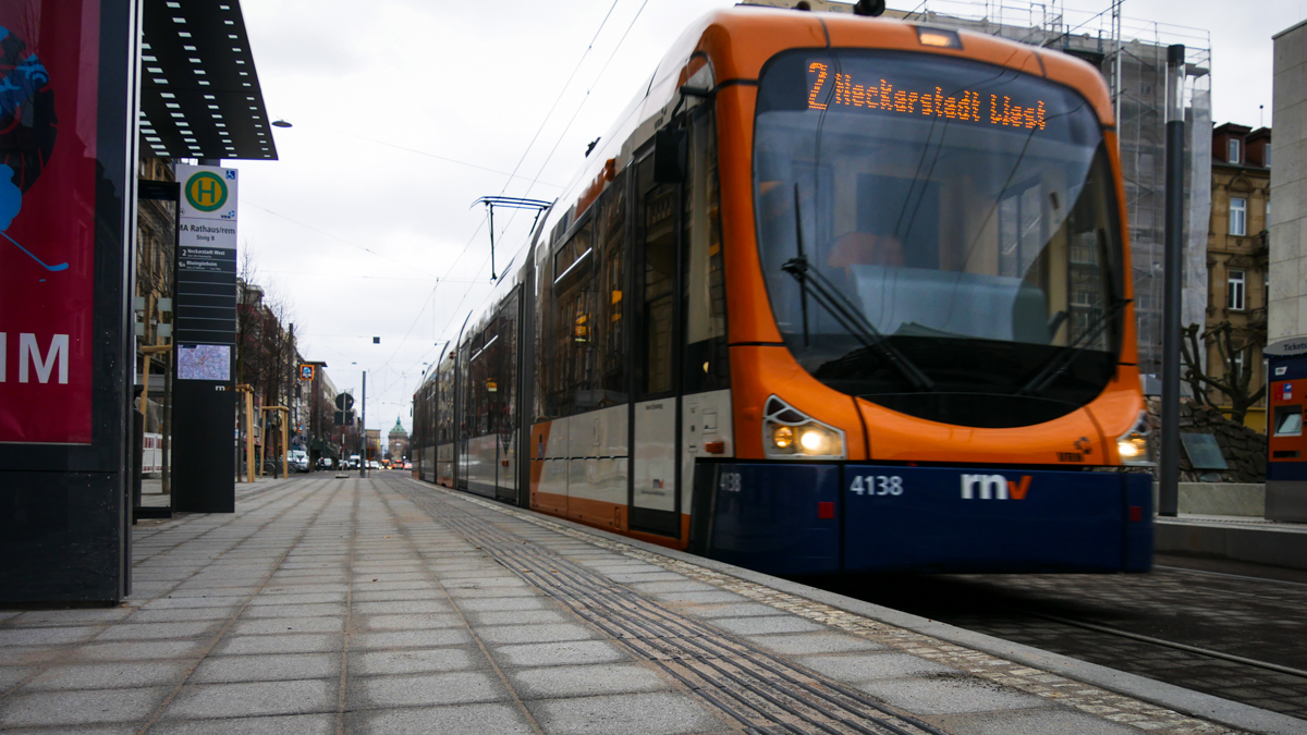 Erster Bürgermeister und ÖPNV-Dezernent Christian Specht, Oberbürgermeister Dr. Peter Kurz, Martin in der Beek, Technischer Geschäftsführer der rnv GmbH, sowie Marcus Geithe, Geschäftsführer der MV Mannheimer Verkehr GmbH, bei der Inbetriebnahme der nun barrierefreien Haltestelle Rathaus/rem.