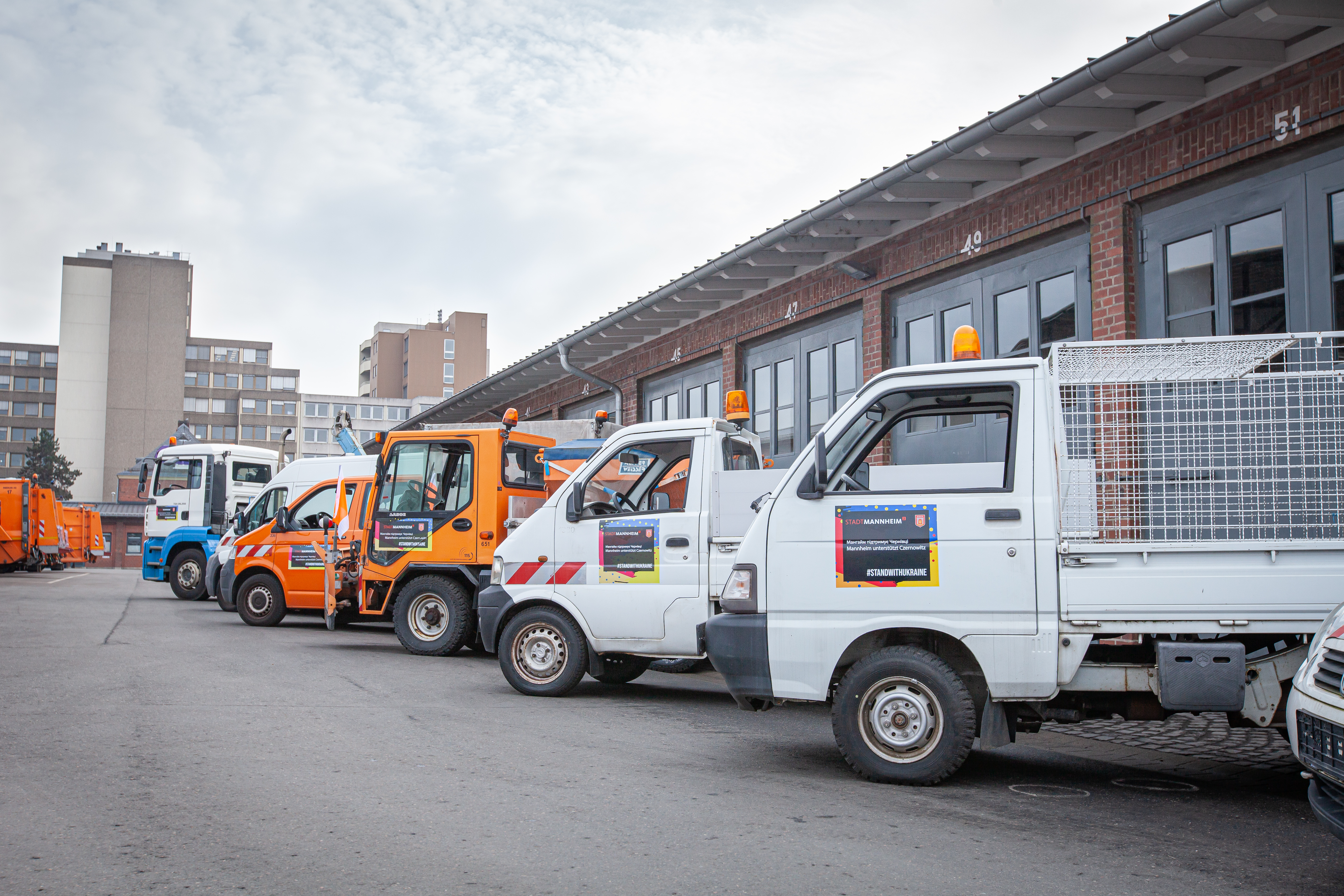 Kommunale Fahrzeuge für Czernowitz: Unser Foto zeigt (von links) Fachbereichsleitung David Linse, Stefanie Miller, (beide Fachbereich Internationales, Europa und Protokoll), Oberbürgermeister Dr. Peter Kurz, Alexander Mauritz (Eigenbetriebsleitung Stadtentwässerung), Bürgermeisterin Prof. Dr. Diana Prezell und Alexandra Kriegel (Mitglied der Eigenbetriebsleitung Stadtraumservice).