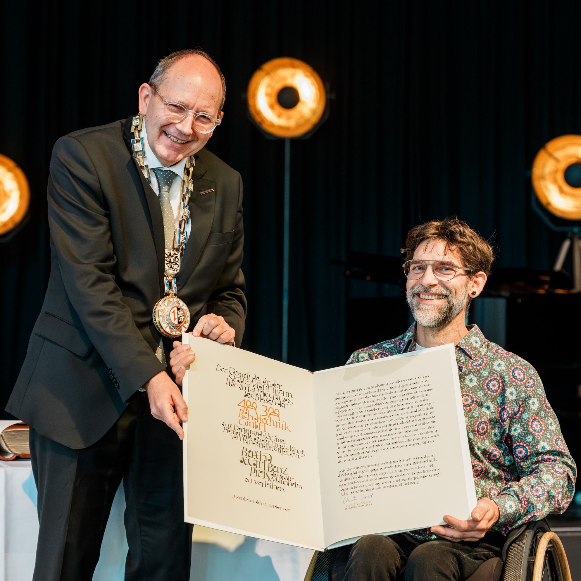 • Oberbürgermeister Specht übergibt die Bertha-und-Carl-Benz-Preis-Urkunde ab Fabian Dirla