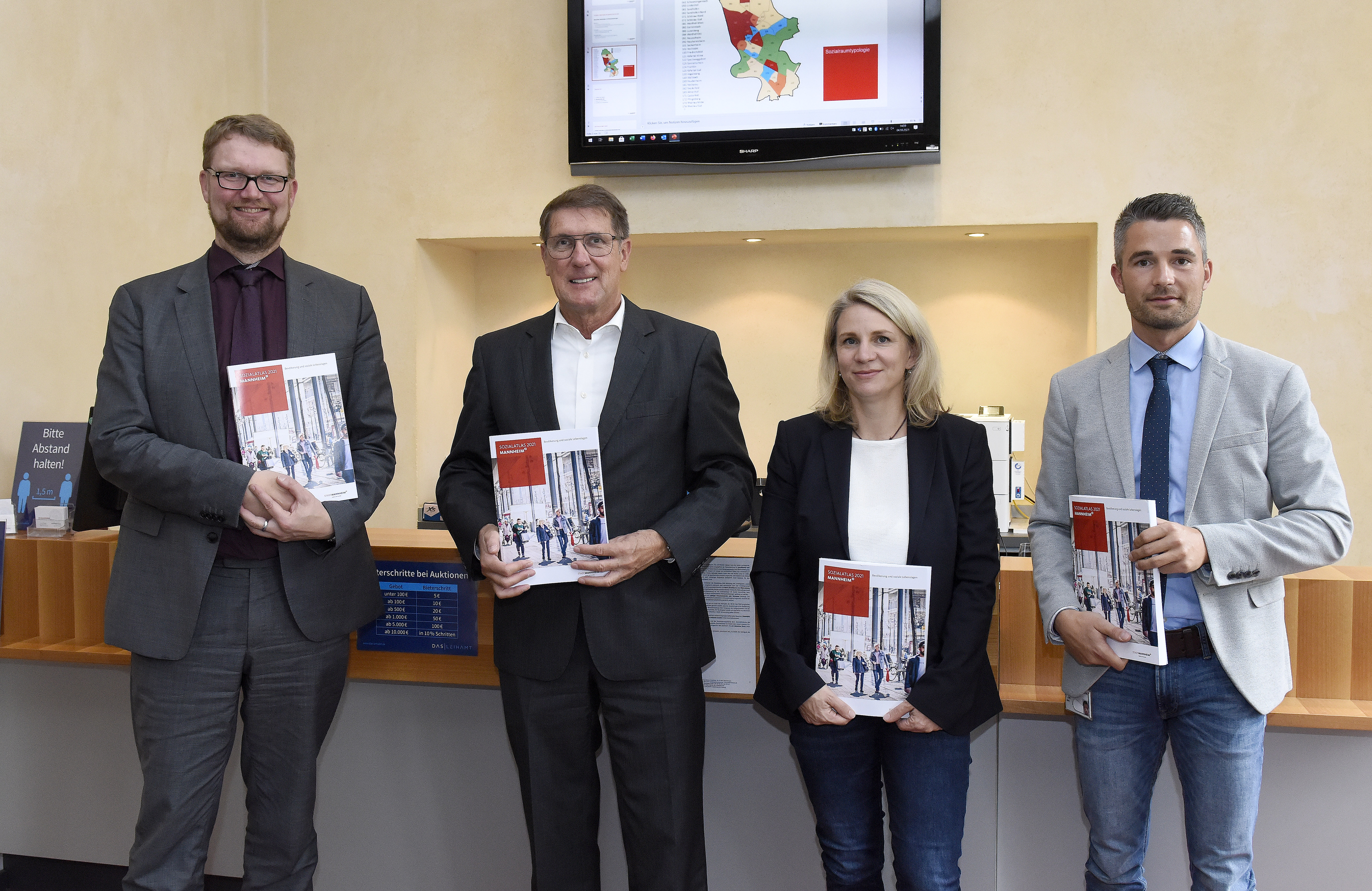 Präsentierten den Mannheimer Sozialatlas 2021 (v.l.): Dr. Jens Hildebrandt, Leiter Fachbereich Arbeit und Soziales, Sozialbürgermeister Michael Grötsch, sowie Milena Etges-Steidlinger und Tobias Korn von dem Fachbereich Arbeit und Soziales.