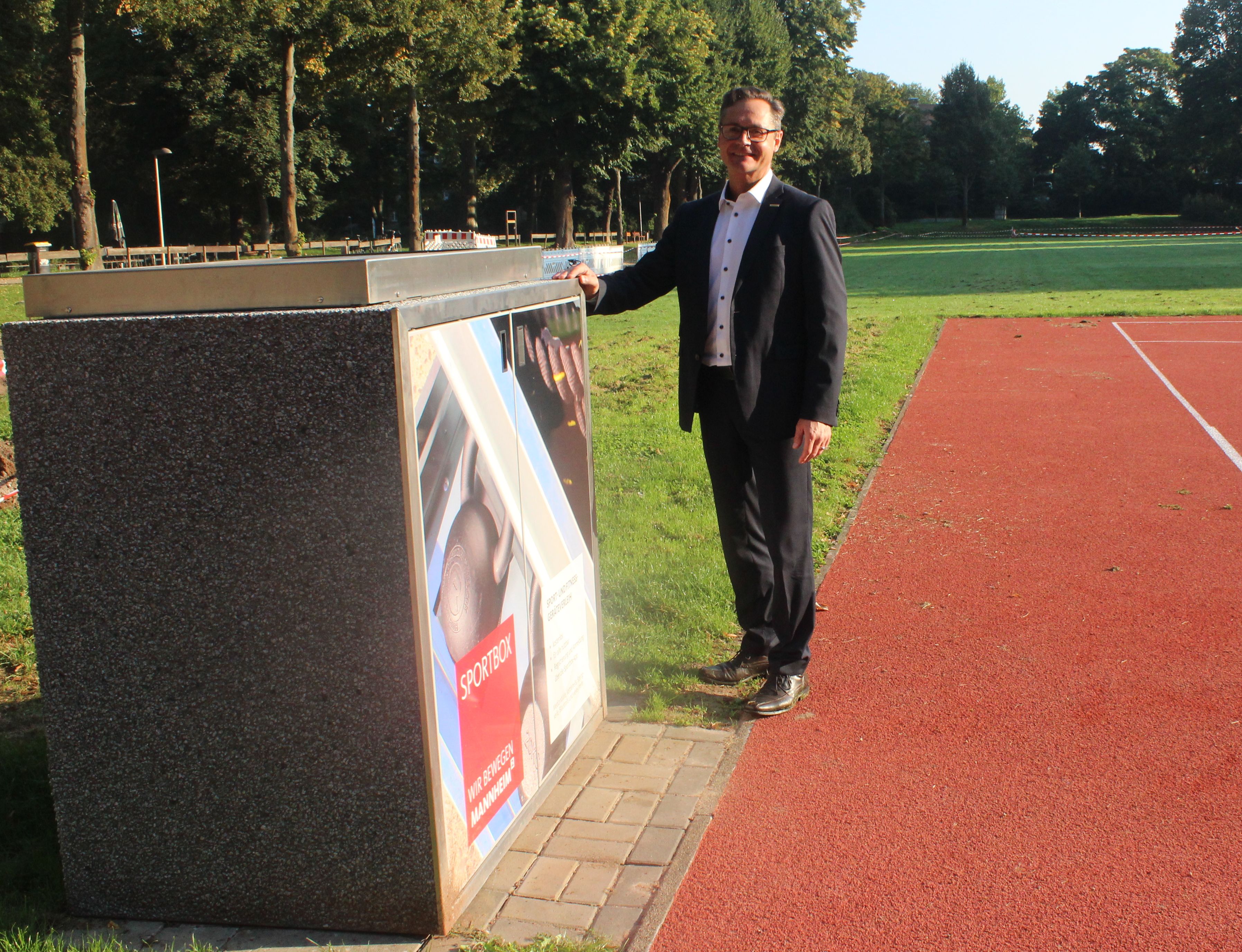Ab sofort kann die neue Sportbox am Unteren Luisenpark bequem per App und kostenfrei genutzt werden. Für Sportbürgermeister Ralf Eisenhauer ist sie ein weiteres attraktives Angebot, im öffentlichen Raum und ohne Vereinszugehörigkeit Sport in Mannheim betreiben zu können.