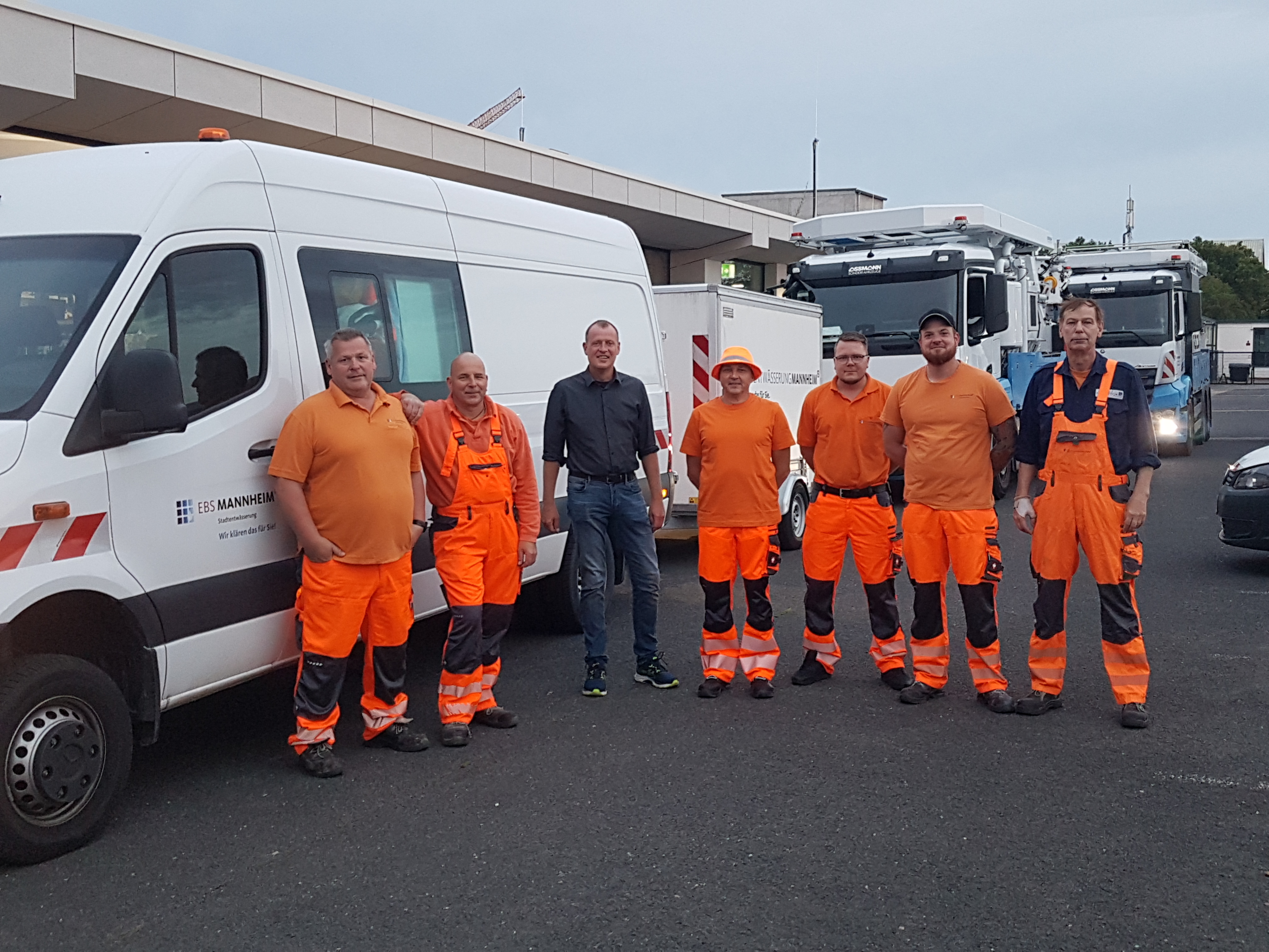 Die Mitarbeiter der Stadtentwässerung Mannheim v.l.n.r. Erich Sold, Marcus Preuss, Thomas Röhling, Frank Freundorfer, Kai Bolte, Tobias Müller und Peter Kamrad brechen auf ins Ahrtal.