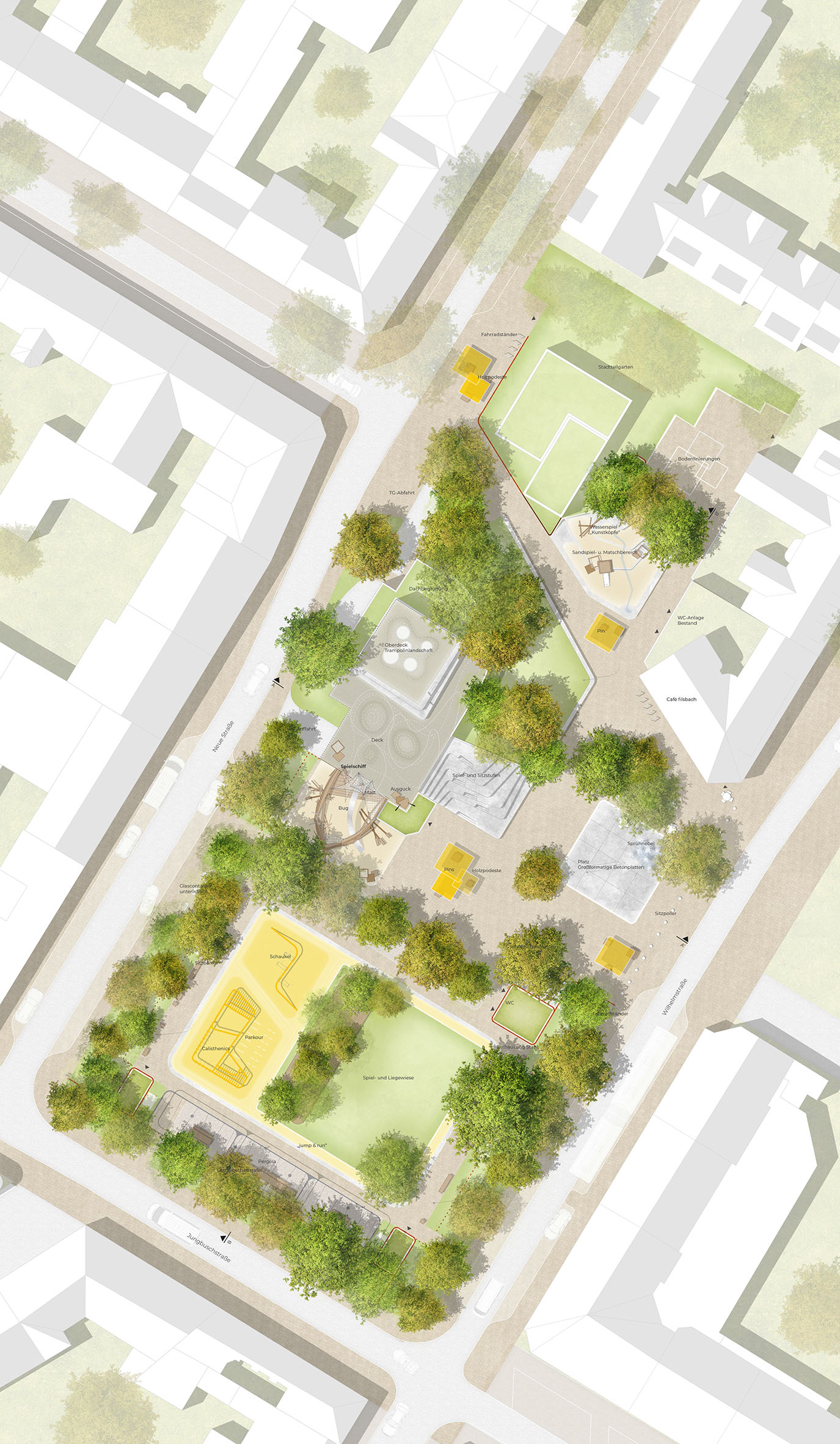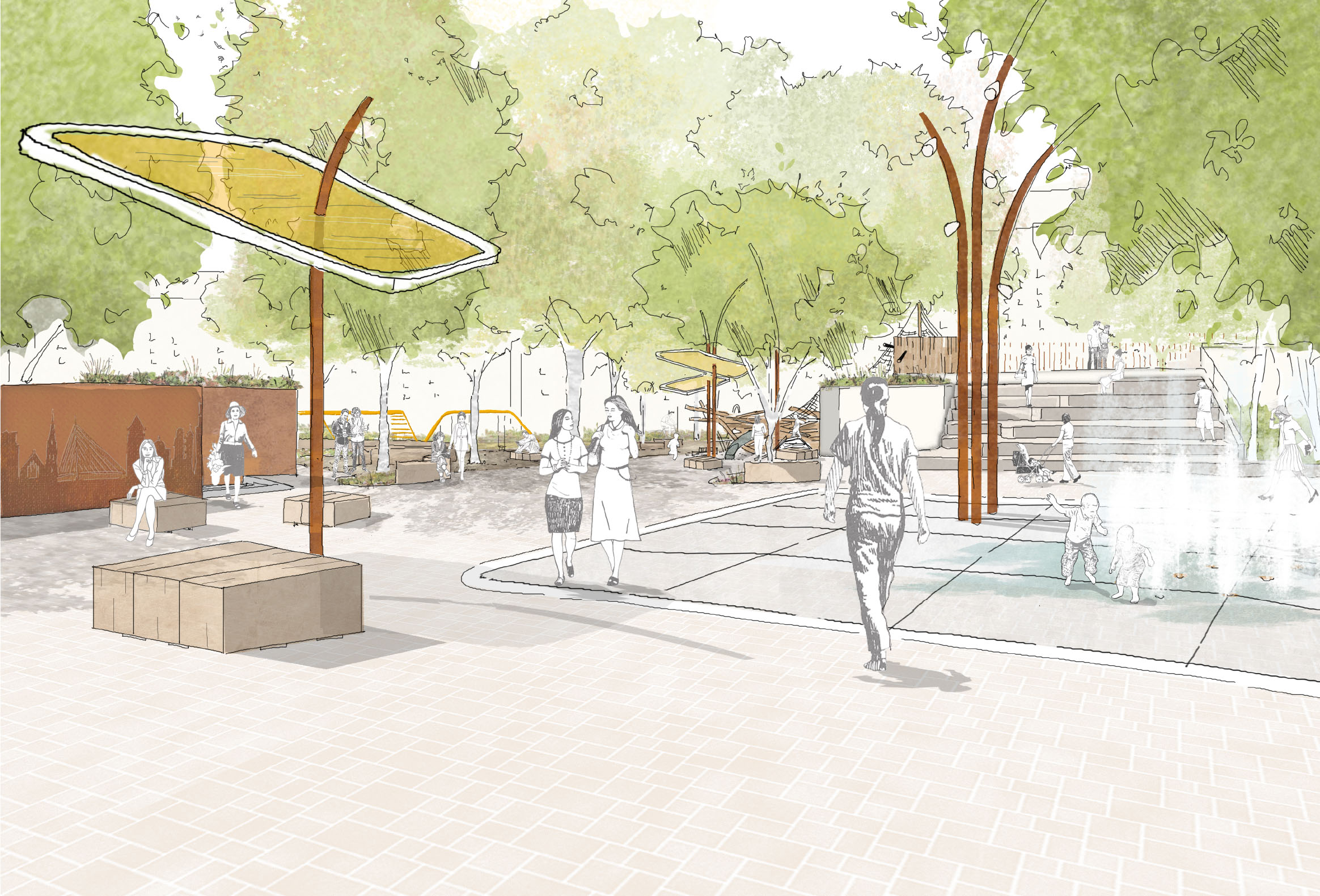 Der Entwurf des Büros Freiraumwerkstadt gliedert den Swanseaplatz in die drei klar zonierten Bereiche Platz, Park und Spielbereich.