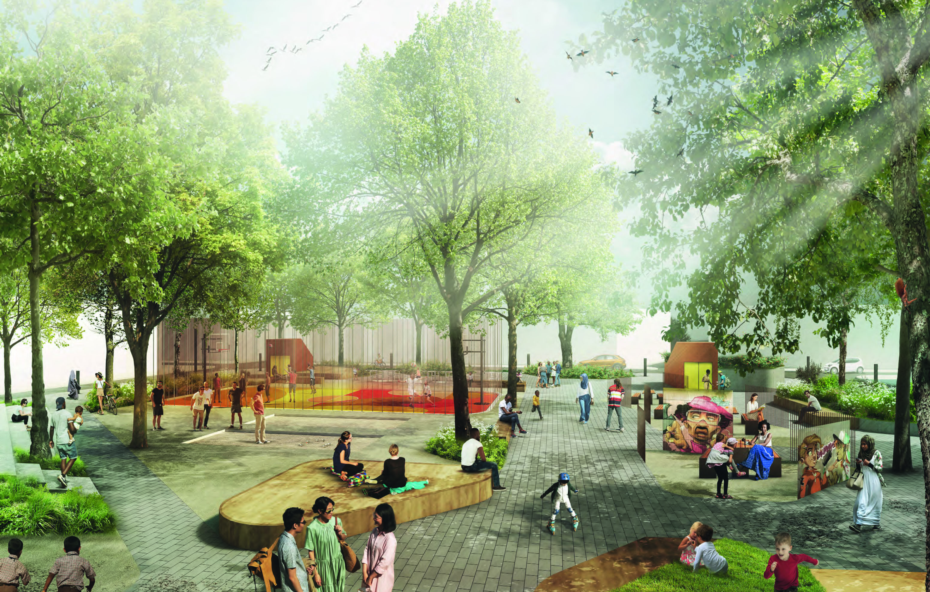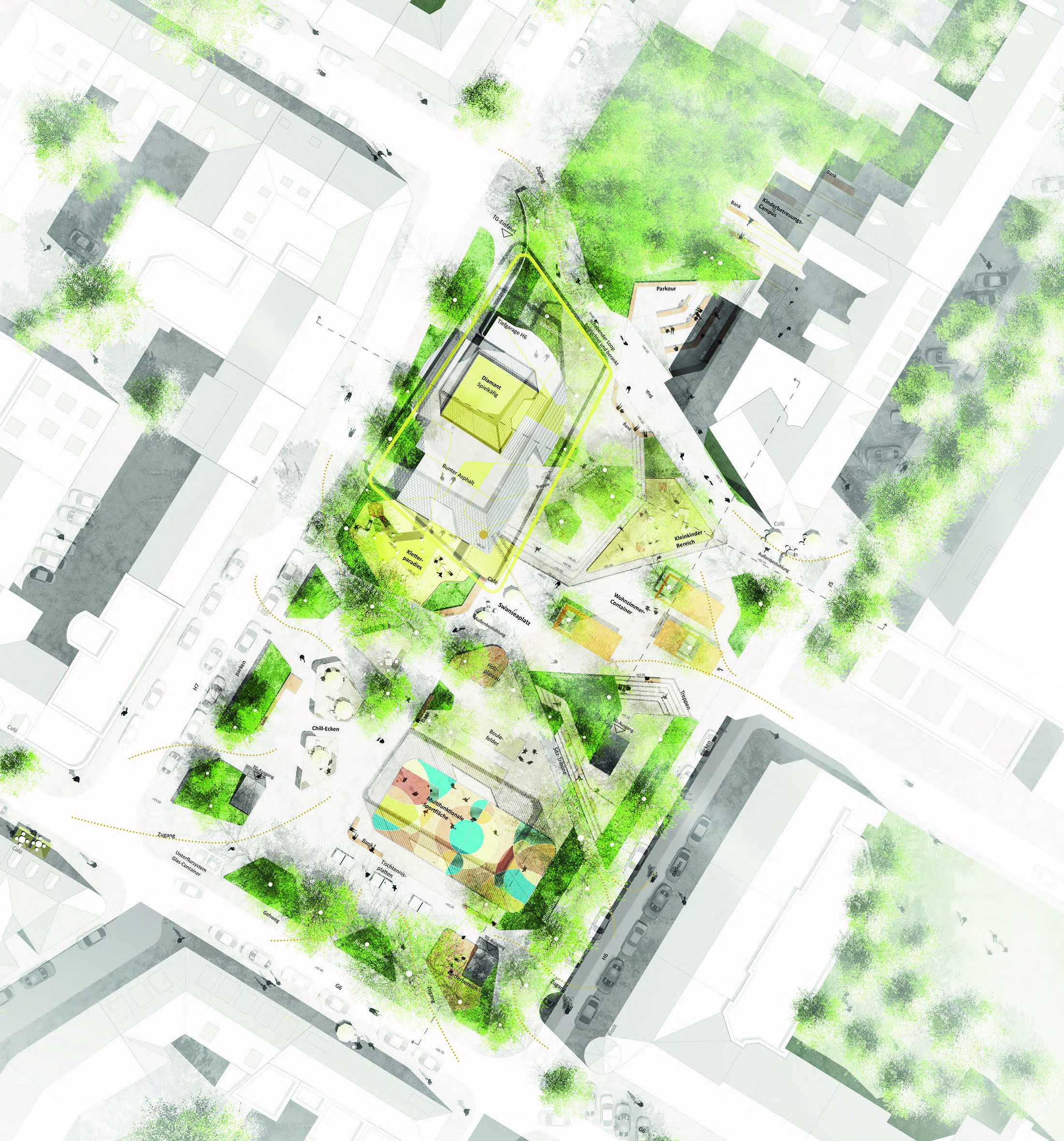 Der Entwurf des Büros GDLA verfolgt den Ansatz eines offen gestalteten urbanen Raums mit verschiedenen Aktivitäts- und Ruheinseln.